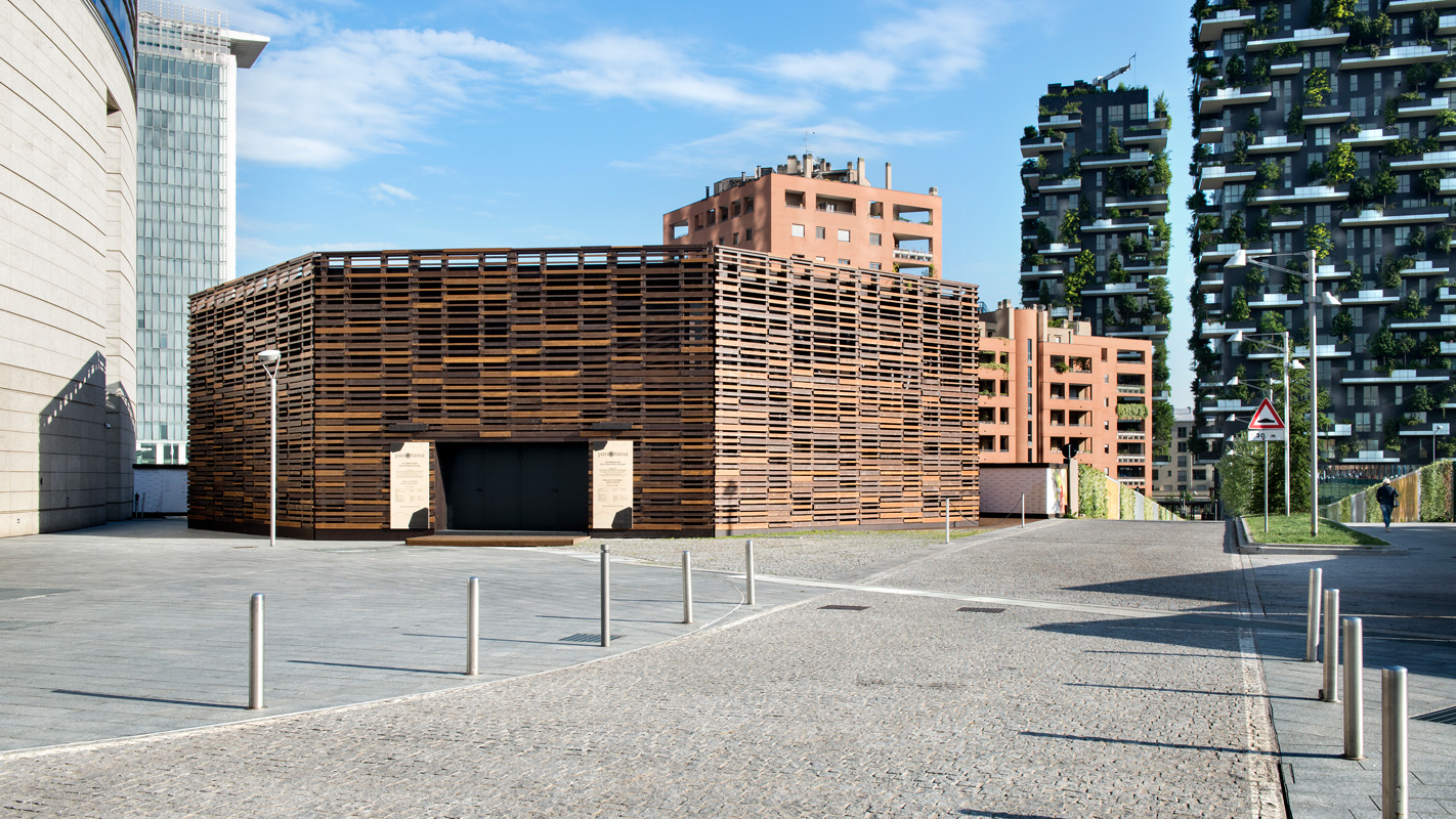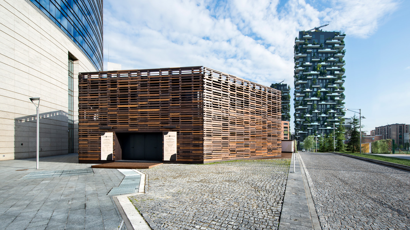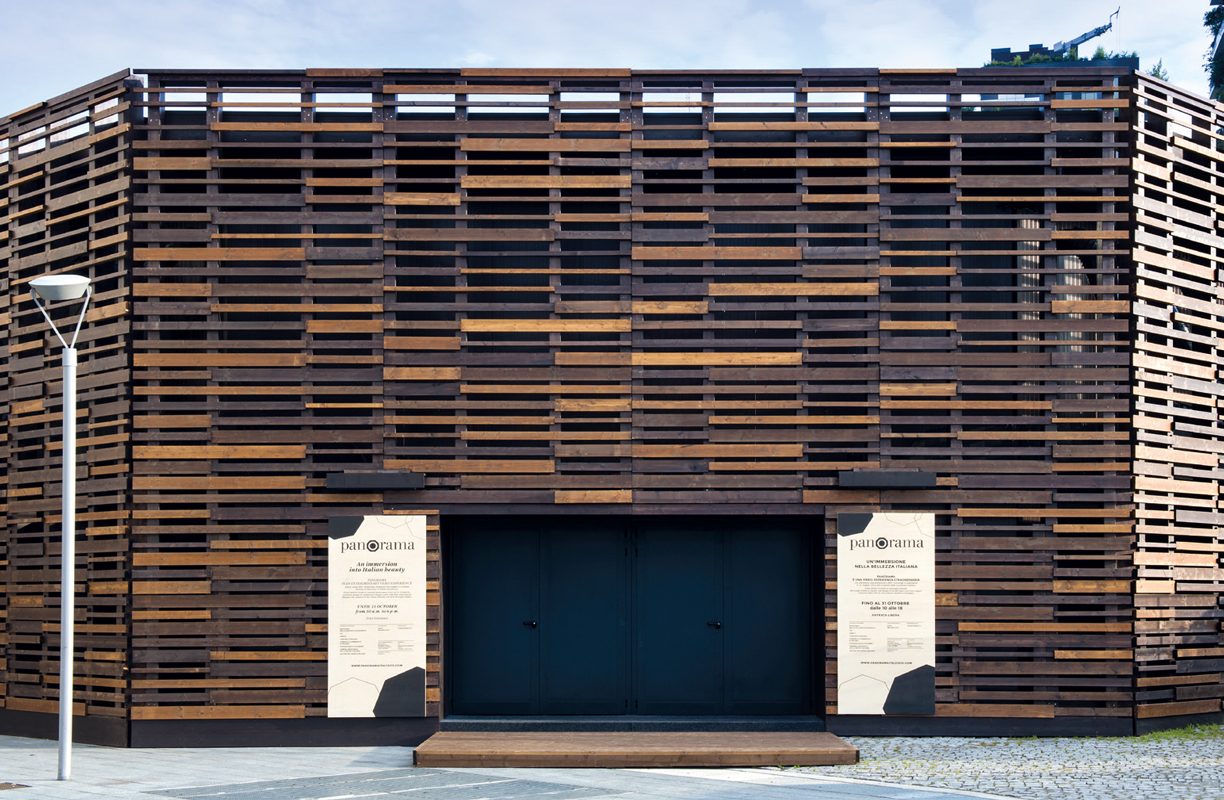 Supporting the structure was a central steel pillar, on which were placed projectors from which fixed and moving images radiated onto the interior surface as if on a 360° screen, involving the spectator in an emotional experience. The pavilion was entirely covered on the outside by four large panels of fir grating on each side, with a polychrome colouring that gave the installation a scenic effect.