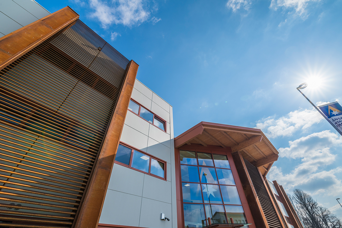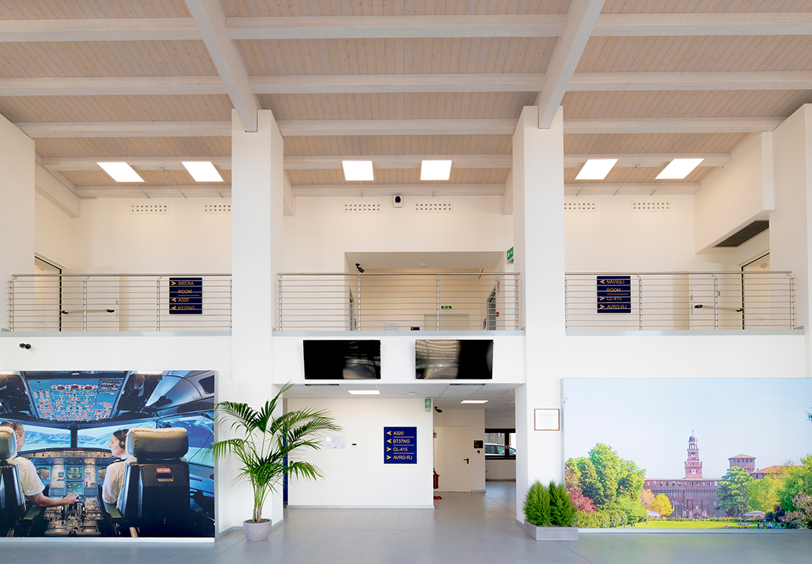 The “Training Pilot Center,” spanning approximately 3,000 m2 and housing four flight simulators along with their offices and classrooms, was built in an expansion area of the Malpensa Airport situated between the two terminals. The building, realised on a turnkey basis by Moretti Modular Contractor, integrates reinforced concrete and glulam into the prefabricated structures.