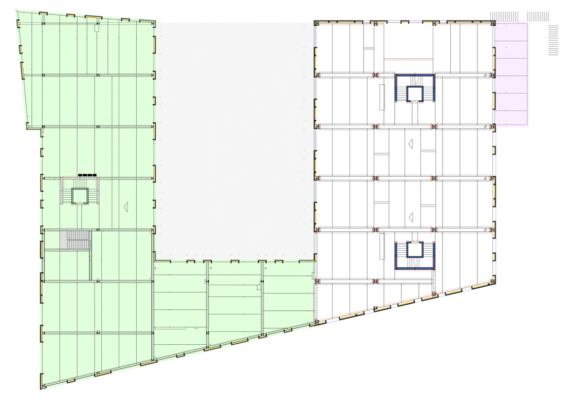 The Arbed Smart Center is a multi-storey building composed of two volumes. Its structural scheme employs a hybrid system that combines reinforced-concrete and steel components. The load-bearing grid follows a classic 8 × 8 m module, with 25 cm-thick floor slabs designed for a live load of 800 kg/m².