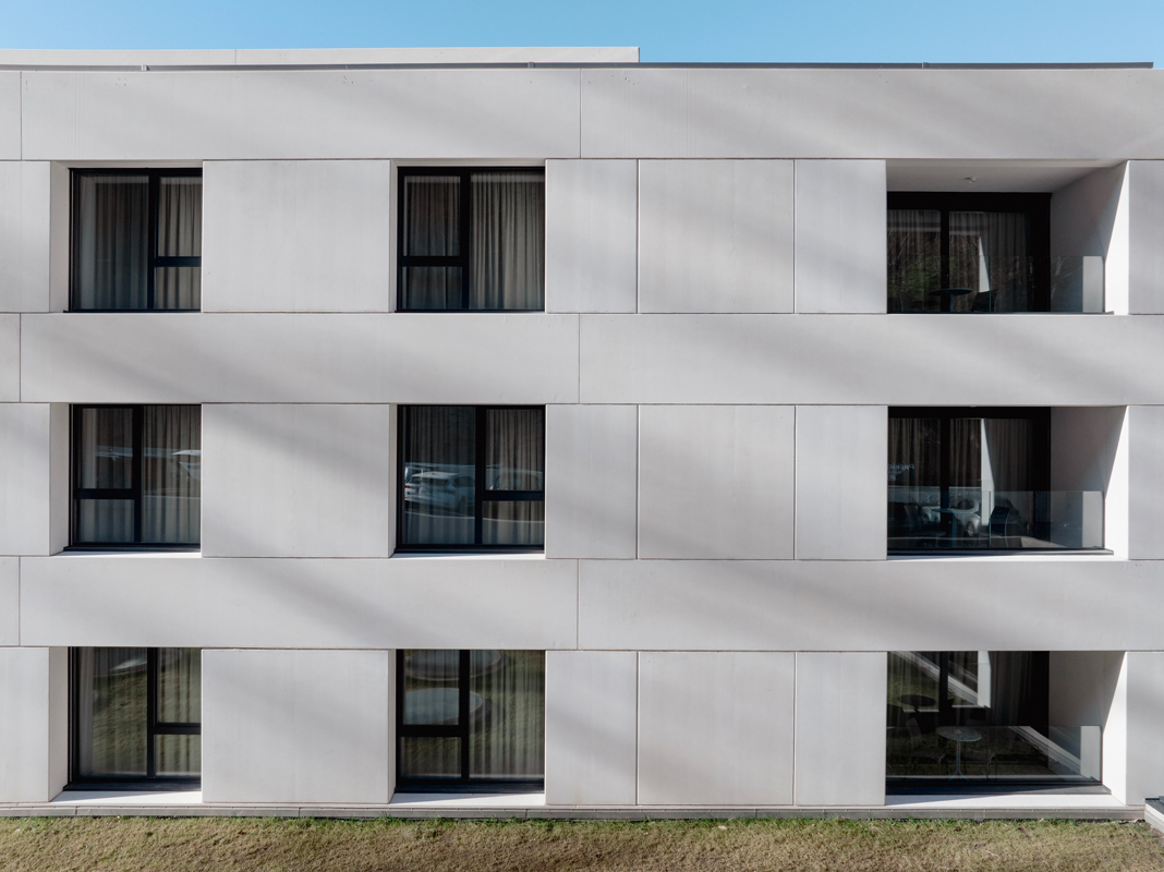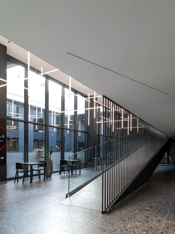 Set in a striking landscape, the complex consists of two buildings—five and four storeys respectively—surrounding a spacious central courtyard. Covering roughly 13,000 m², it blends multiple functions (office, retail, hospitality, dining and wellness) into a new “business-living” concept that seeks to rebalance the relationship between people and their environment.