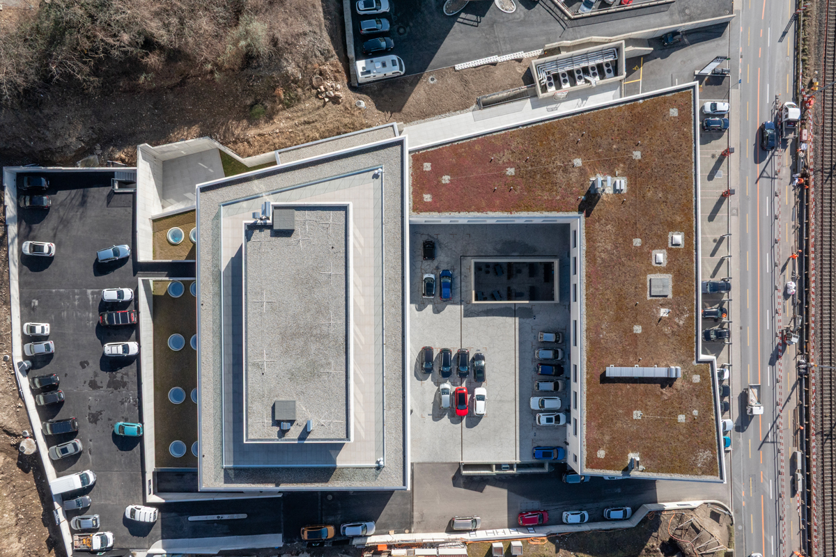 Environmental sustainability is further expressed on the roof, where an extensive green layer boosts energy performance, provides excellent insulation and regulates interior humidity, all in harmony with the surrounding landscape.