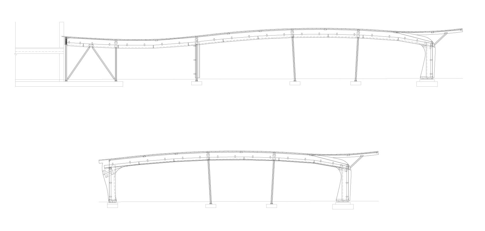 In contrast to the curved facade, a ceiling with vertical wooden slat panels follows the portal’s contour, adding dynamism to the ceiling. The continuous color contrasts lend depth to the entire setup. The characteristics of laminated wood—its warmth, naturalness, and lightness—enhance the structure and emphasize its welcoming and hospitable function.