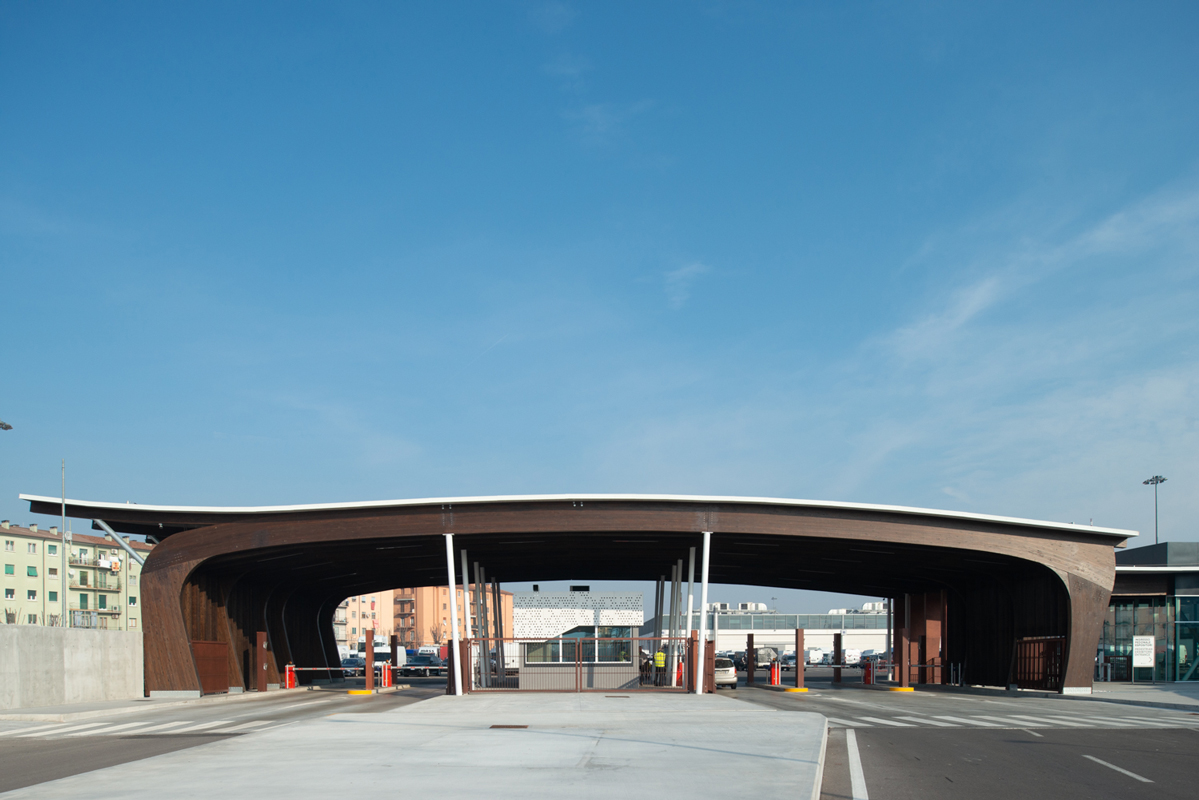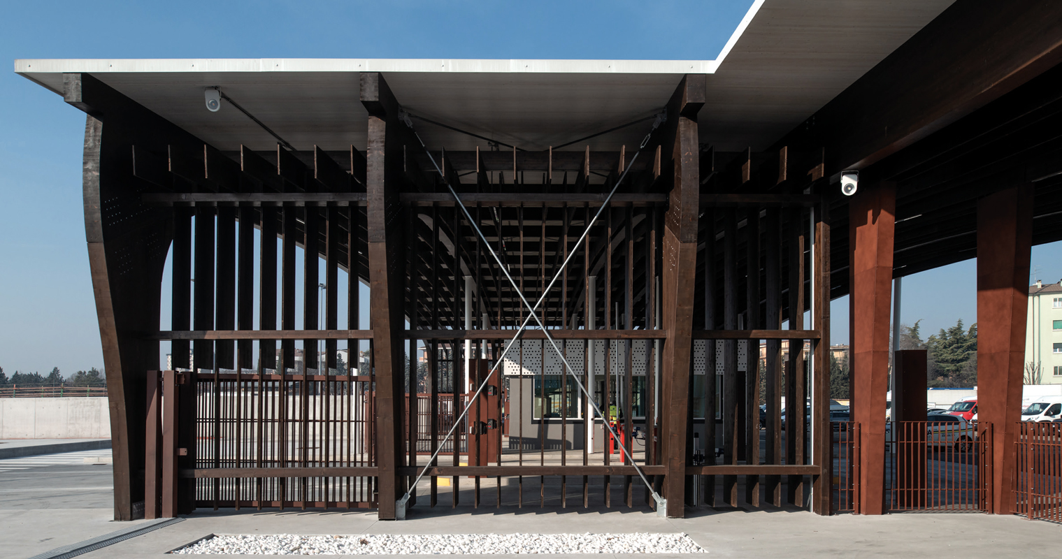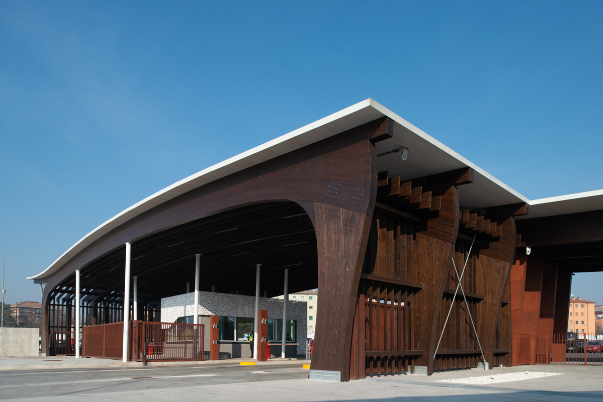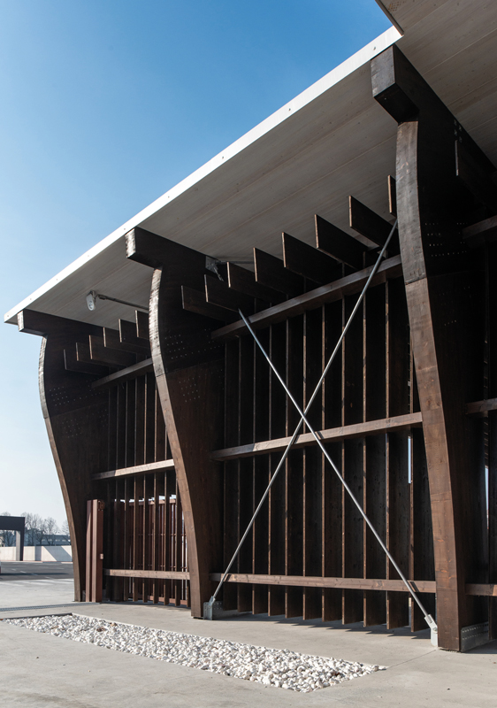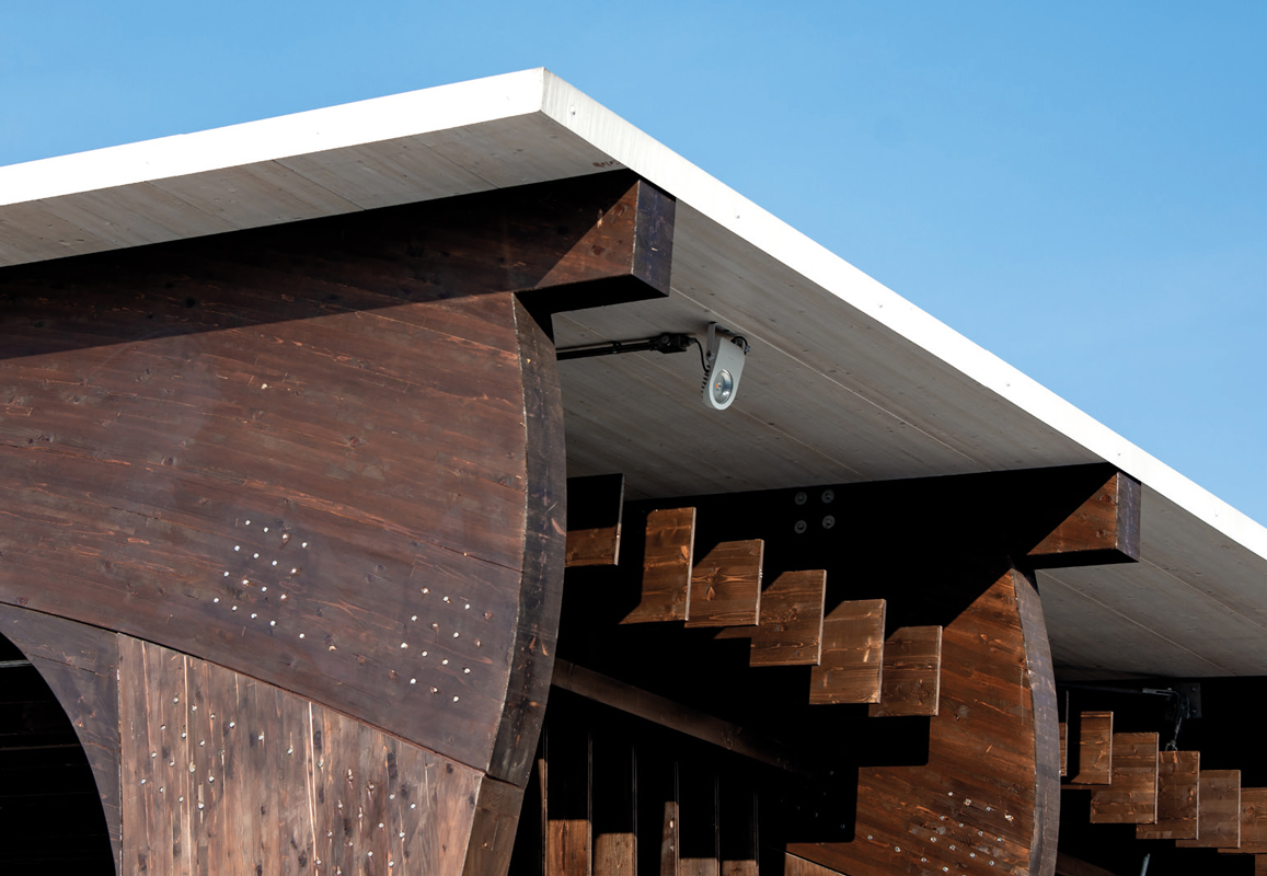 From a construction perspective, the structure, standing 7 m tall, consists of 6 laminated wood portals. Three of these are 58 m long and the other three are 36 m long, with intervals marked by steel pilasters. The roofing is made of horizontal laminated wood. In the spaces between the various portals, multilayer panels that replicate their design were used. The construction and installation time was particularly compressed: the entire structure was assembled and completed in just one month.