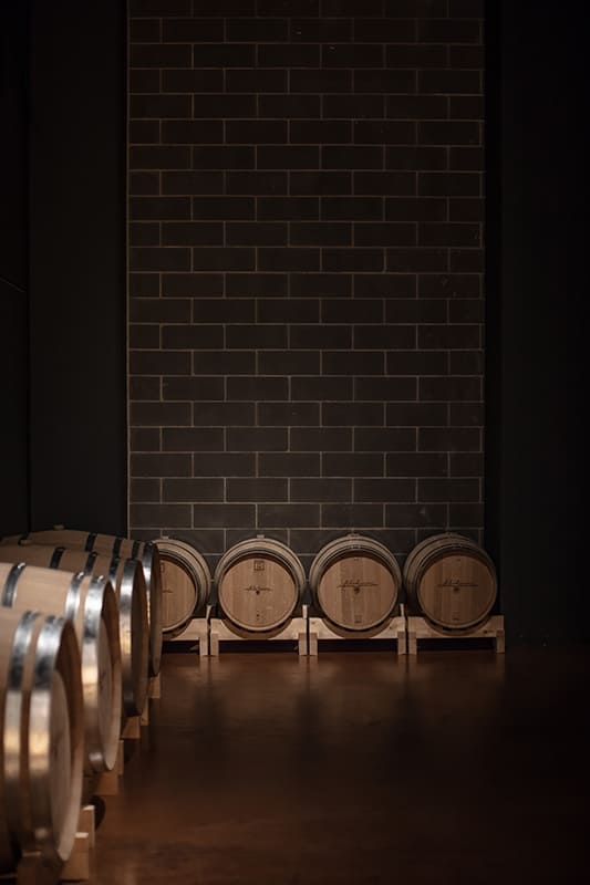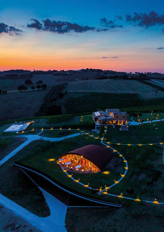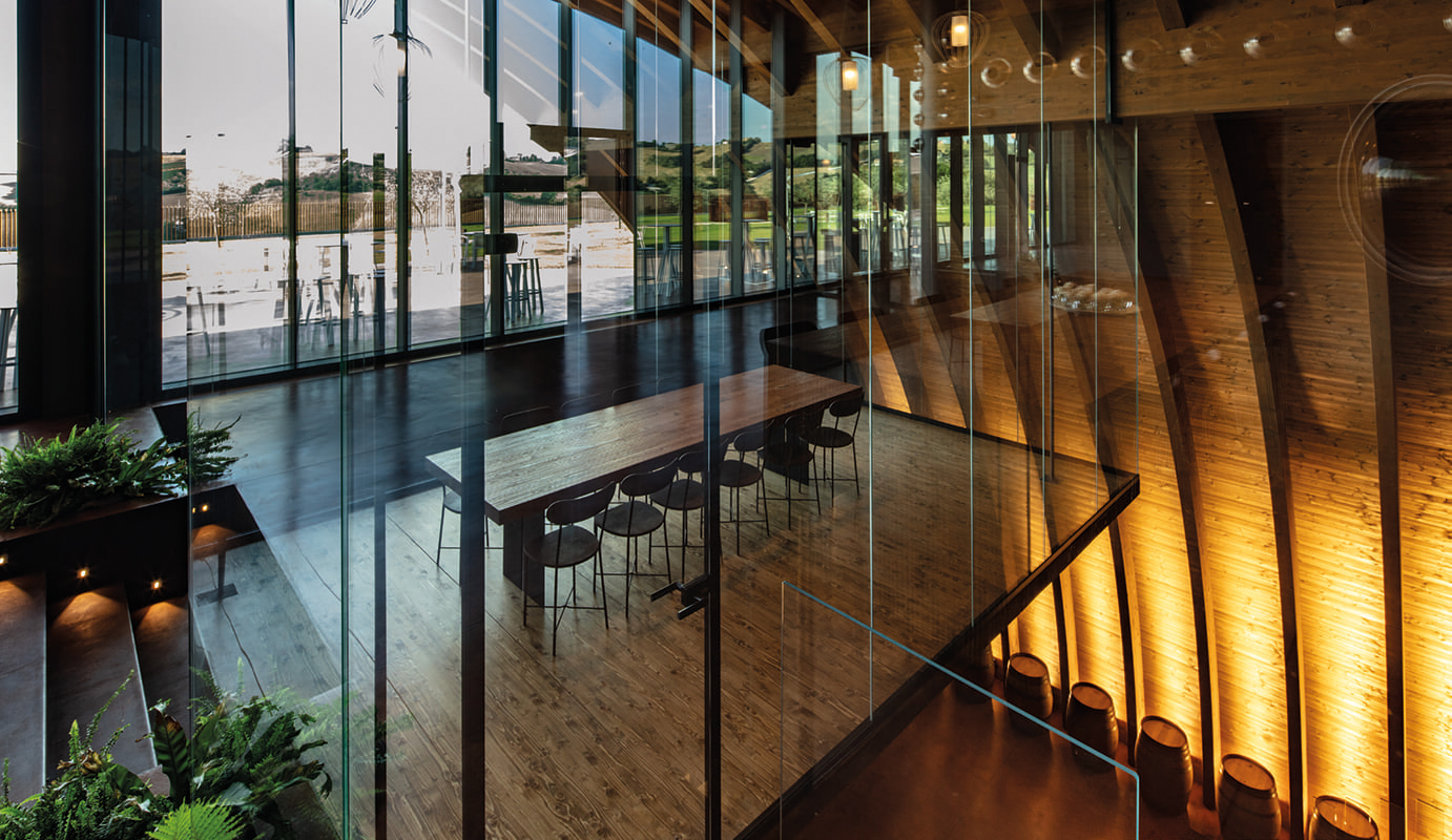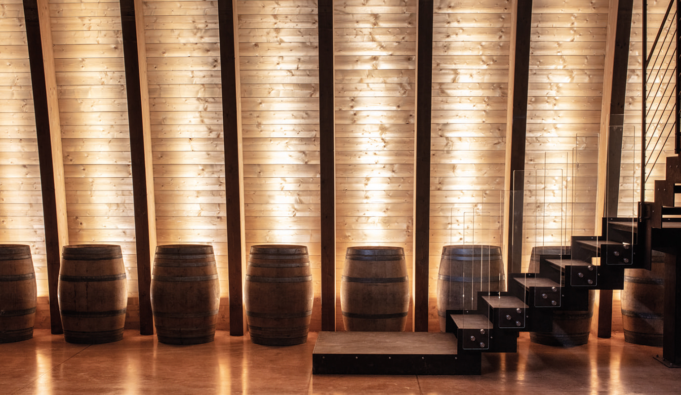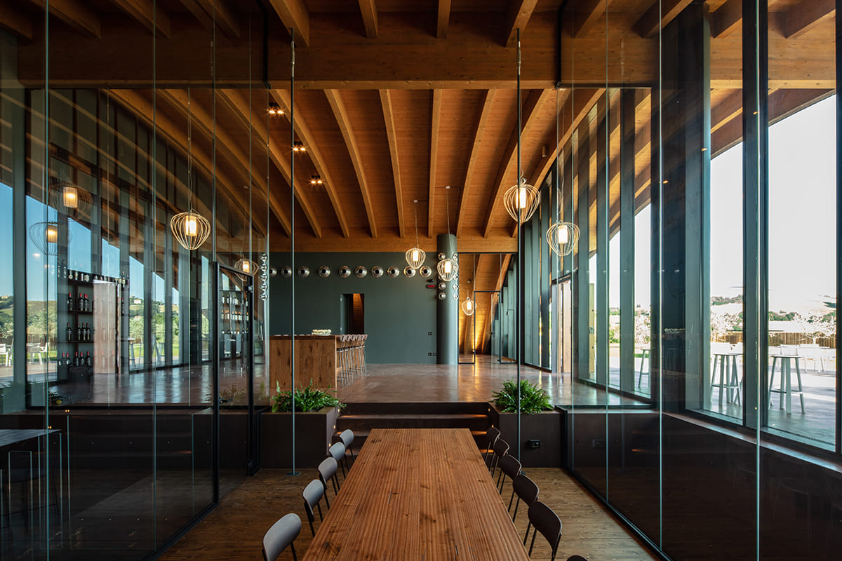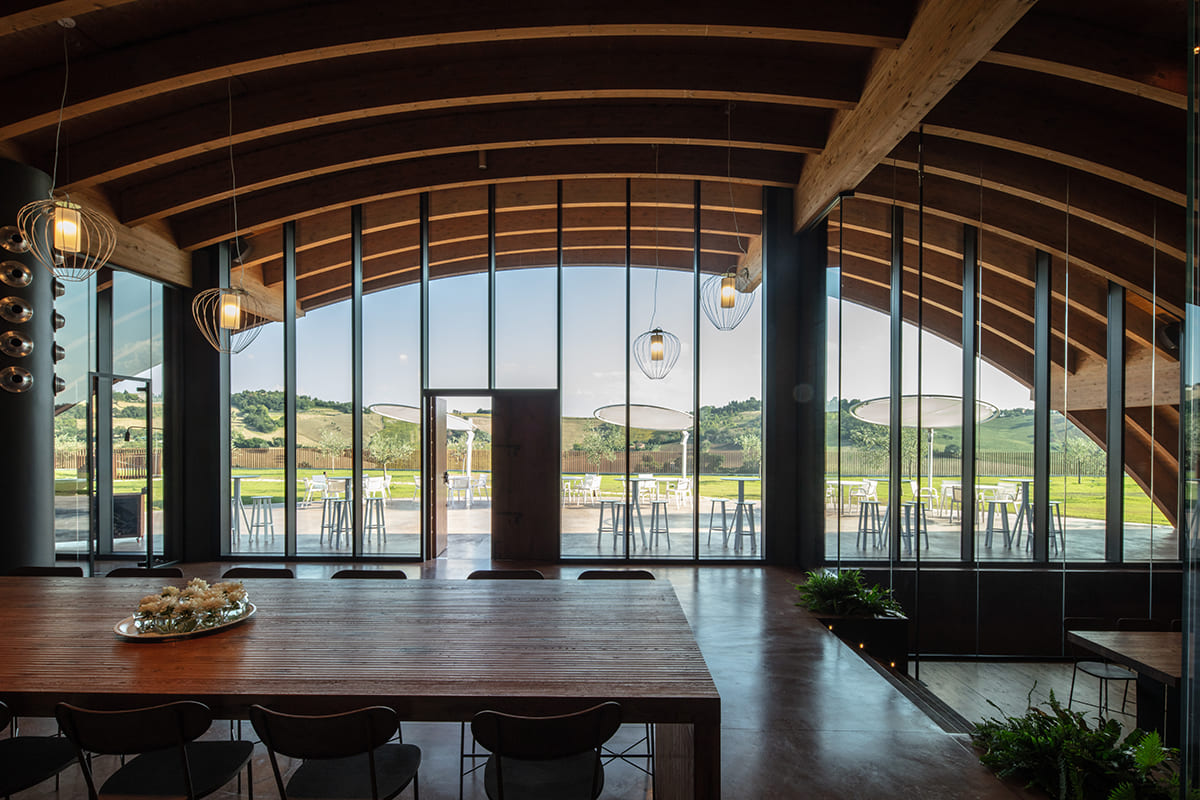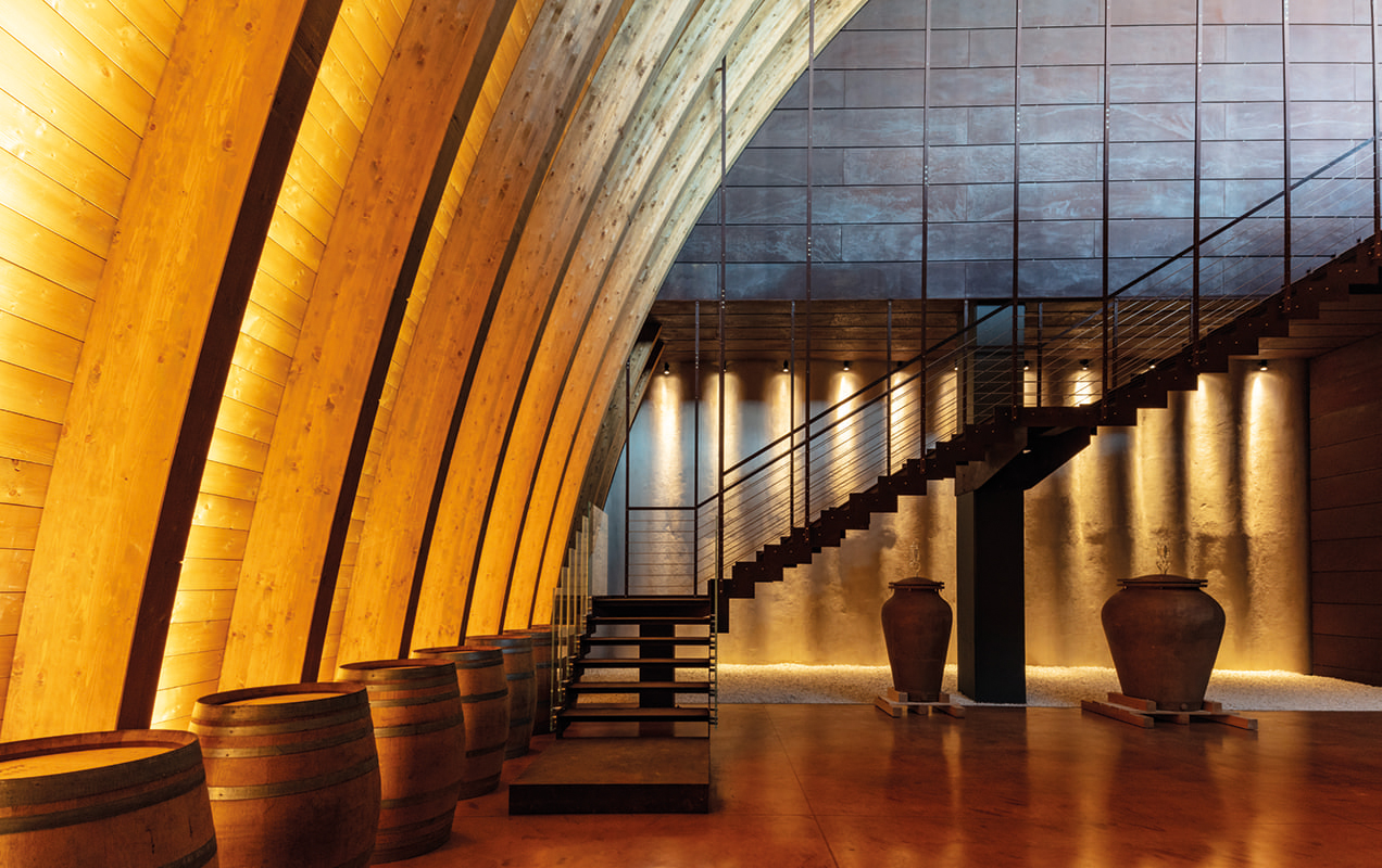 The building spans two levels. The basement, approximately 1750 m2 houses the functional areas for wine production: from the area where the grapes are received and processed, to the space where we find the stainless steel containers for vinification, from a room for drying grapes to one for bottling, from the wine storage to the barrel room, as well as service areas for staff and operations. The first floor only covers part of the ground floor and inside it features a visitor reception and tasting area, characterized by a 24 m2 mezzanine hanging from the roof beams, the projecting structure of which can be seen from the basement. The twelve wooden arches of the dome, which extend cantilevered outside the entrance of the tasting room, recreate inside the sensation of being in a large barrel. The two floors are connected by two staircases: a straight internal one that connects the tasting room to the barrel room and an external spiral staircase, which leads from the roof garden to the covered area of the basement.