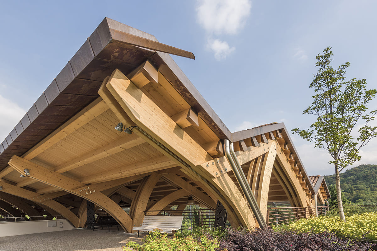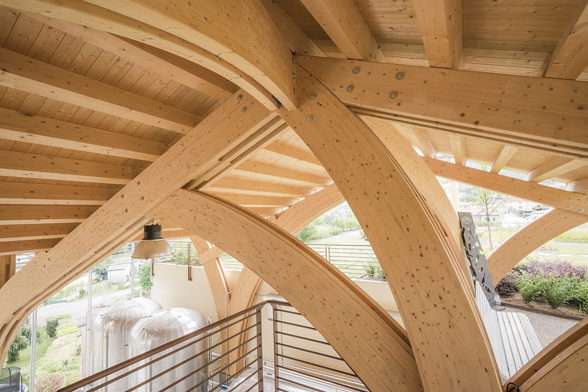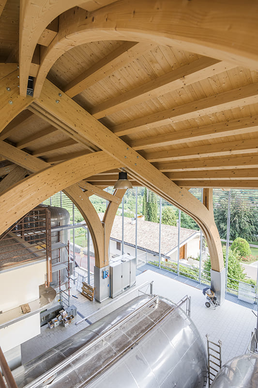 Laminated wood is the absolute main character of the architecture of Cantina Foss Marai, which develops entirely around its roof, following the design of its spans. Under the wooden vault, the different functions of the structure are located: from the productive areas (the winemaking area, the bottling plants, the storage warehouse) to the more relational ones, up to the meeting places and the porticoed spaces from which picturesque views of the surrounding vineyard landscape can be enjoyed. Large curved pillars, made through the expert assembly of paired beams, hold up the roof. Their design recreates the image of large trees, adding further emphasis to the natural aspect of the intervention.