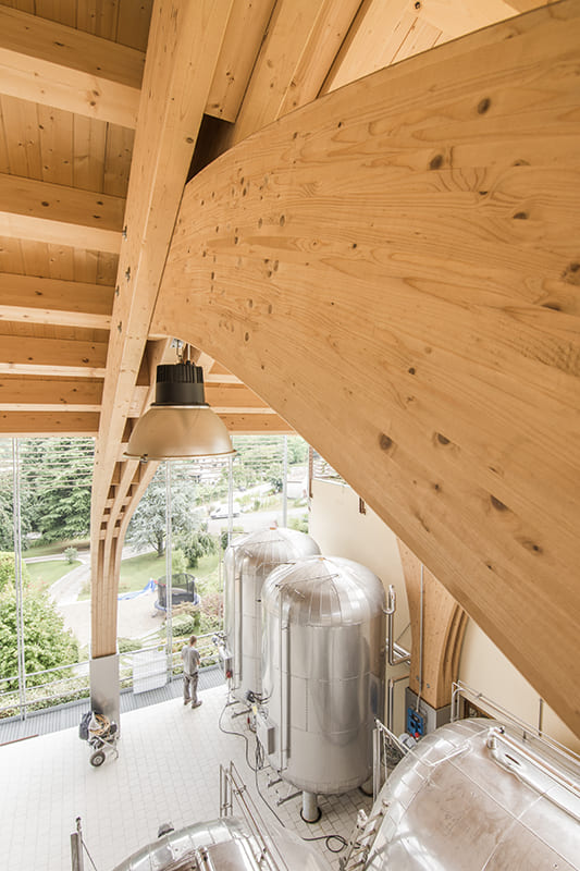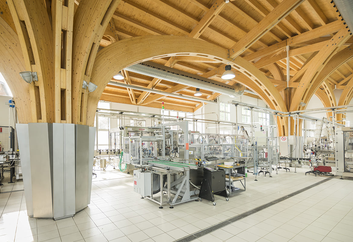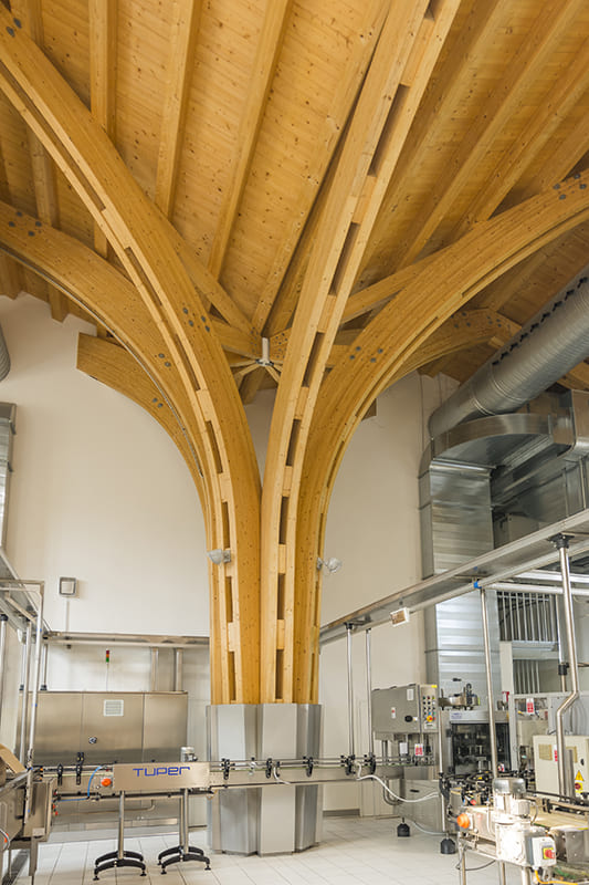 The well-established experience in the design of large laminated wood structures allowed Moretti Modular Contractor to go along with the original structural design and optimize it during execution and production. The large pillars are the core of the project; they support the vault and give rhythm to the architecture of the cellar. Each pillar is composed of a bundle of beams, some straight and others curved, connected to each other by small beams. Each paired beam is then connected to others through concealed plates. The individual pre-cut elements were partly assembled in the company and partly directly on site at the construction site.