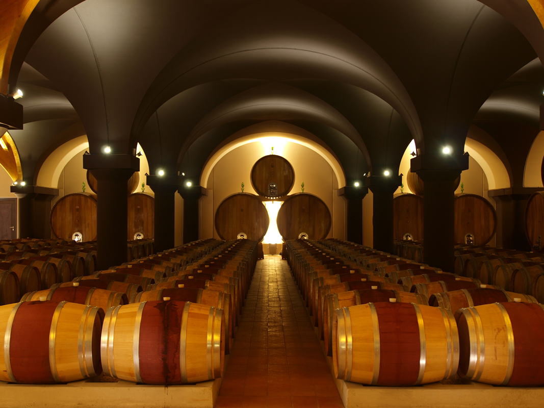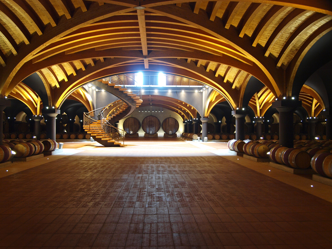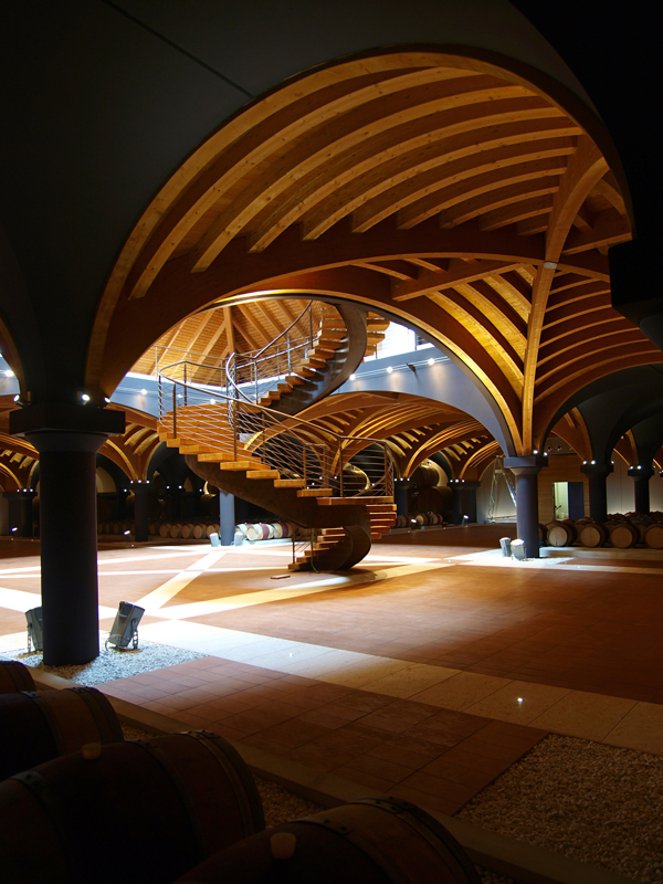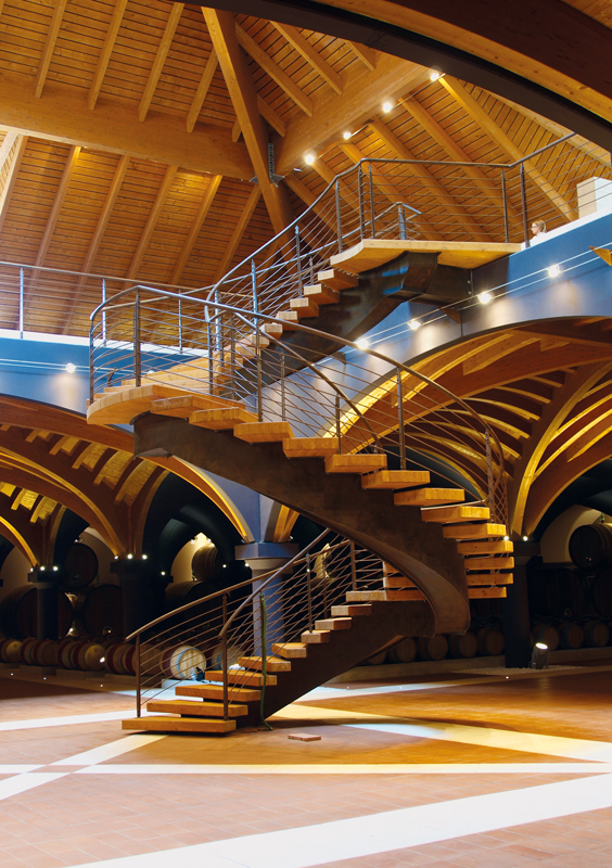 The four identified tunnels have wooden vaults converging into a central shaft, closed by a laminated pavilion with a square footprint (25×25 m). The second level, where there is also a terrace of more than 2,000 square meters, is accessed by a major staircase, also in industrialised construction, that leads to the gallery, overlooking the cellar, on which stands a 24-m-high pyramid of laminated wood and glass summit dome. Externally, the barrel room is clad with prefabricated Prun stone panels in a bundle, creating a dramatic visual effect.