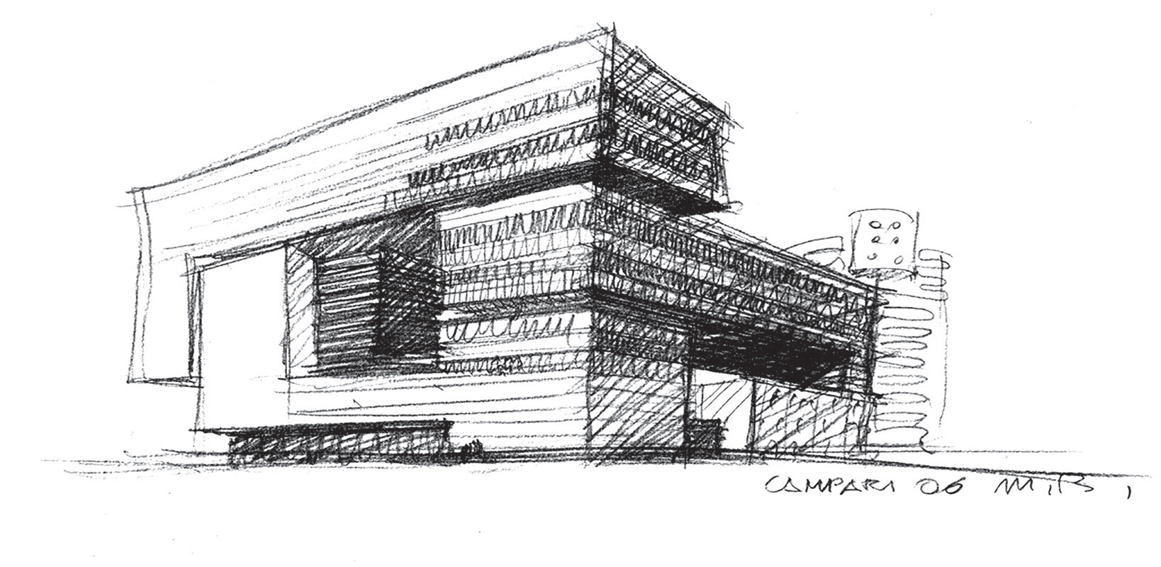 The building consists of nine above-ground floors totaling approximately 12,000 m2, including a 1,500 m2 2m2 lobby and a 1,000 m2 museum located within the historic building, as well as two underground floors totaling approximately 12,000 m2. The structure is entirely prefabricated. A series of concrete beams, pillars, and slabs was used for the underground floors. The above-ground floors consist of a block of nine floors and a mixed steel and prefabricated concrete central bridge structure, which is positioned at right angles and extends over the top of the existing historic industrial building. The covered plaza, constructed using prefabricated laminated structures, seamlessly transitions into the existing historic park, enhanced by the rooftop garden. The façades feature a “double skin” of glass and exposed terracotta, through the use of planks that, in addition to defining an aesthetic identity, have a sunshade function.