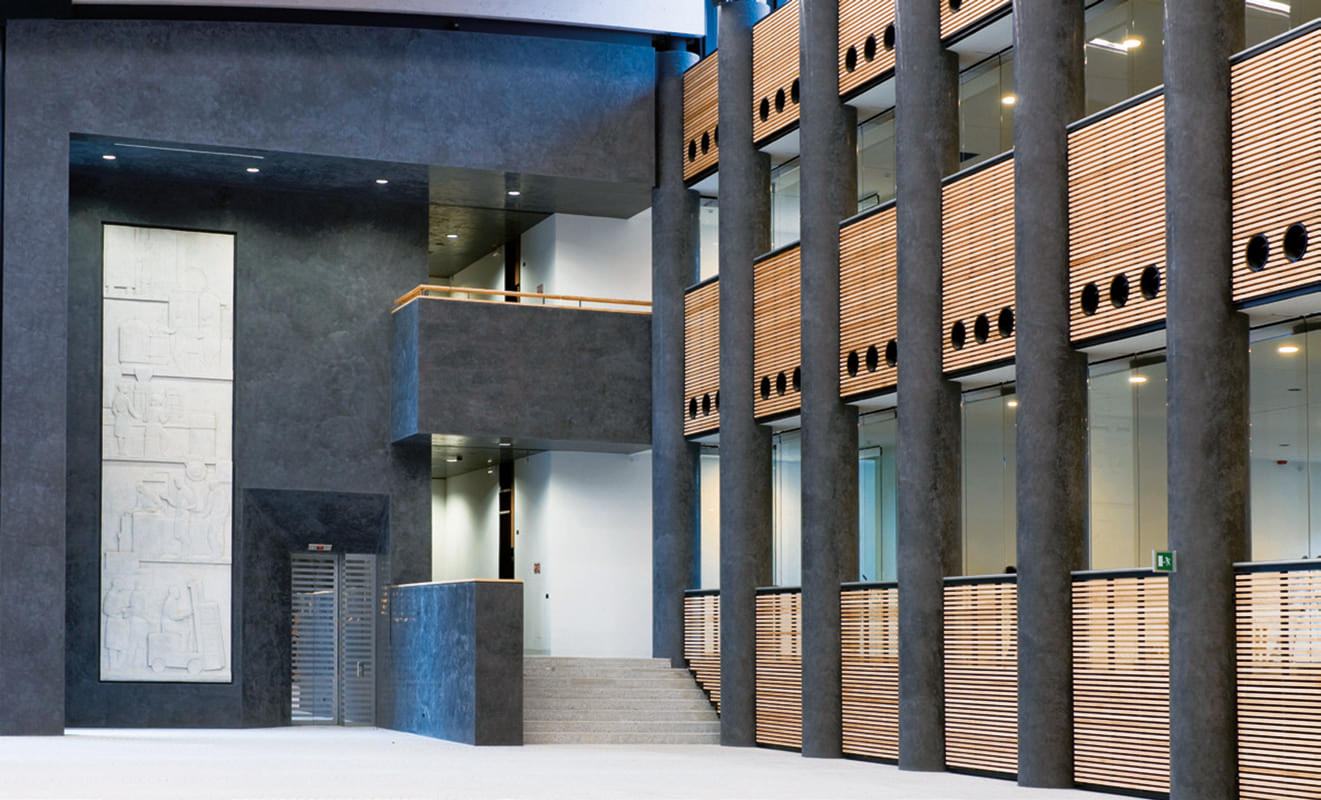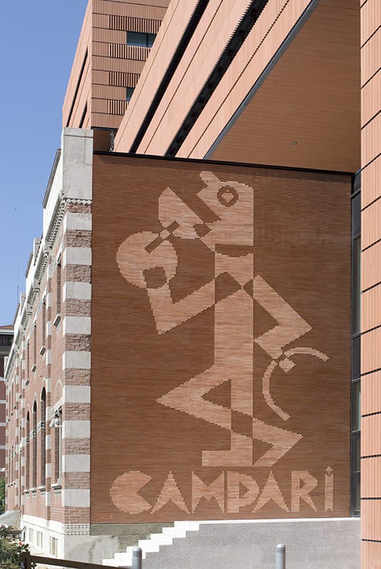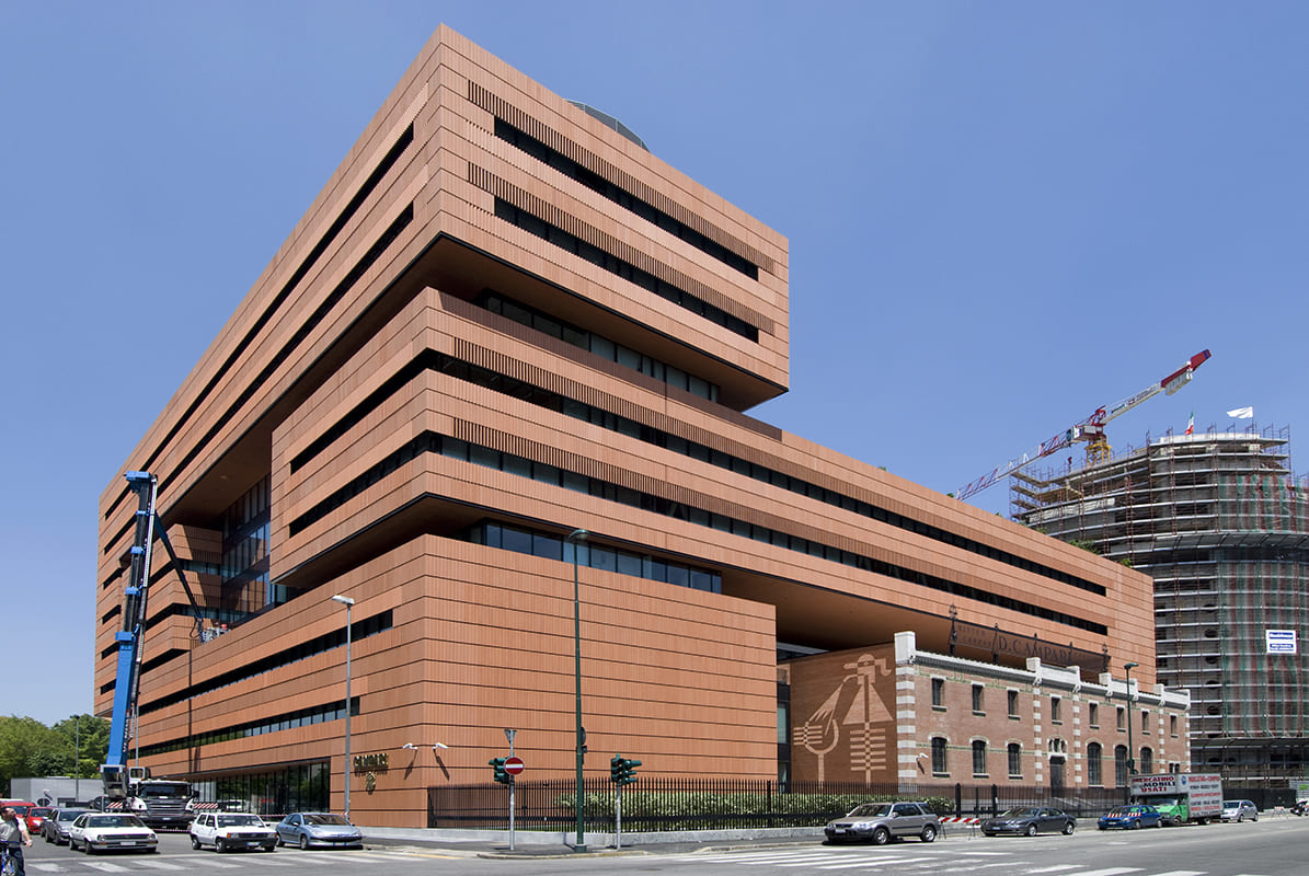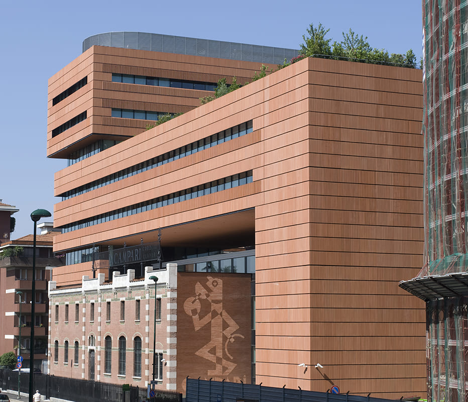 The building consists of nine above-ground floors totaling approximately 12,000 m2, including a 1,500 m2 2m2 lobby and a 1,000 m2 museum located within the historic building, as well as two underground floors totaling approximately 12,000 m2. The structure is entirely prefabricated. A series of concrete beams, pillars, and slabs was used for the underground floors. The above-ground floors consist of a block of nine floors and a mixed steel and prefabricated concrete central bridge structure, which is positioned at right angles and extends over the top of the existing historic industrial building. The covered plaza, constructed using prefabricated laminated structures, seamlessly transitions into the existing historic park, enhanced by the rooftop garden. The façades feature a “double skin” of glass and exposed terracotta, through the use of planks that, in addition to defining an aesthetic identity, have a sunshade function.