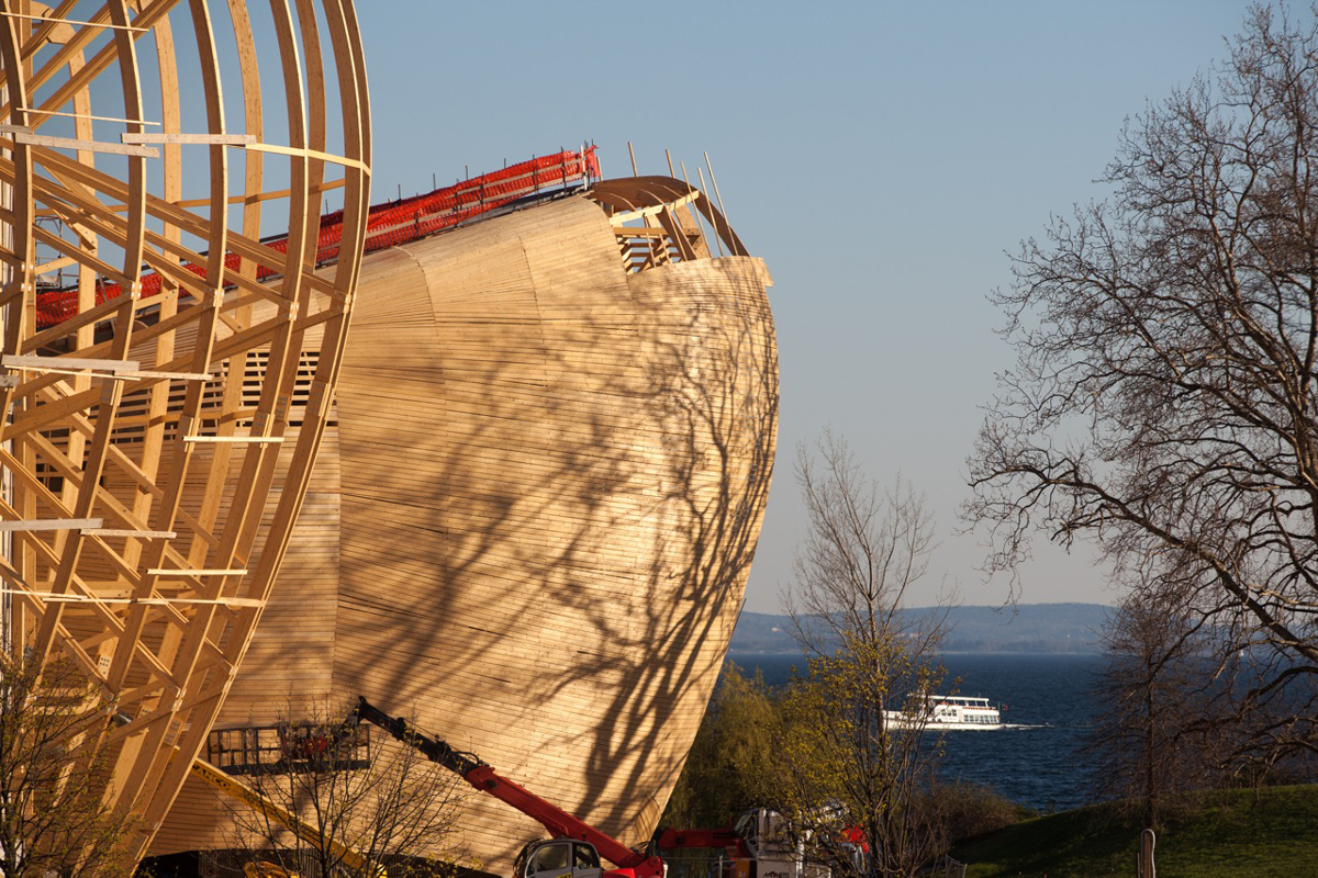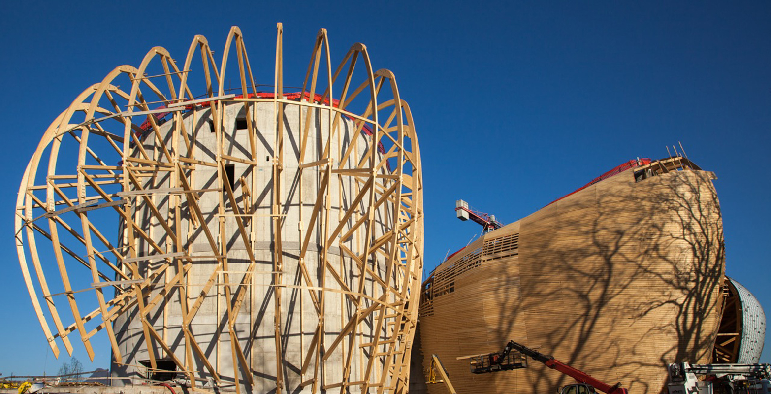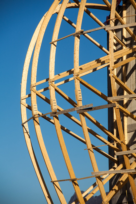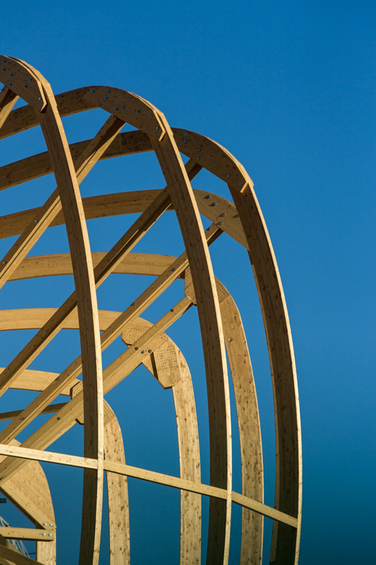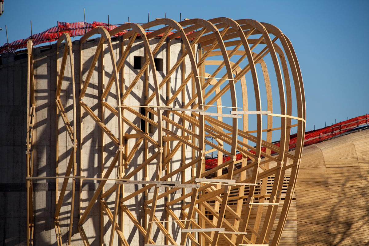 The complexity determined by the shape of the buildings that make up the work has been resolved through a dense network of glulam beams, each of which has a different design and length, with a maximum linear development of 25 m. The roof covering that joins the spans between the different beams was also designed and constructed in glulam, with curved boards joined together at the ends. A work under the banner of the highest customisation.