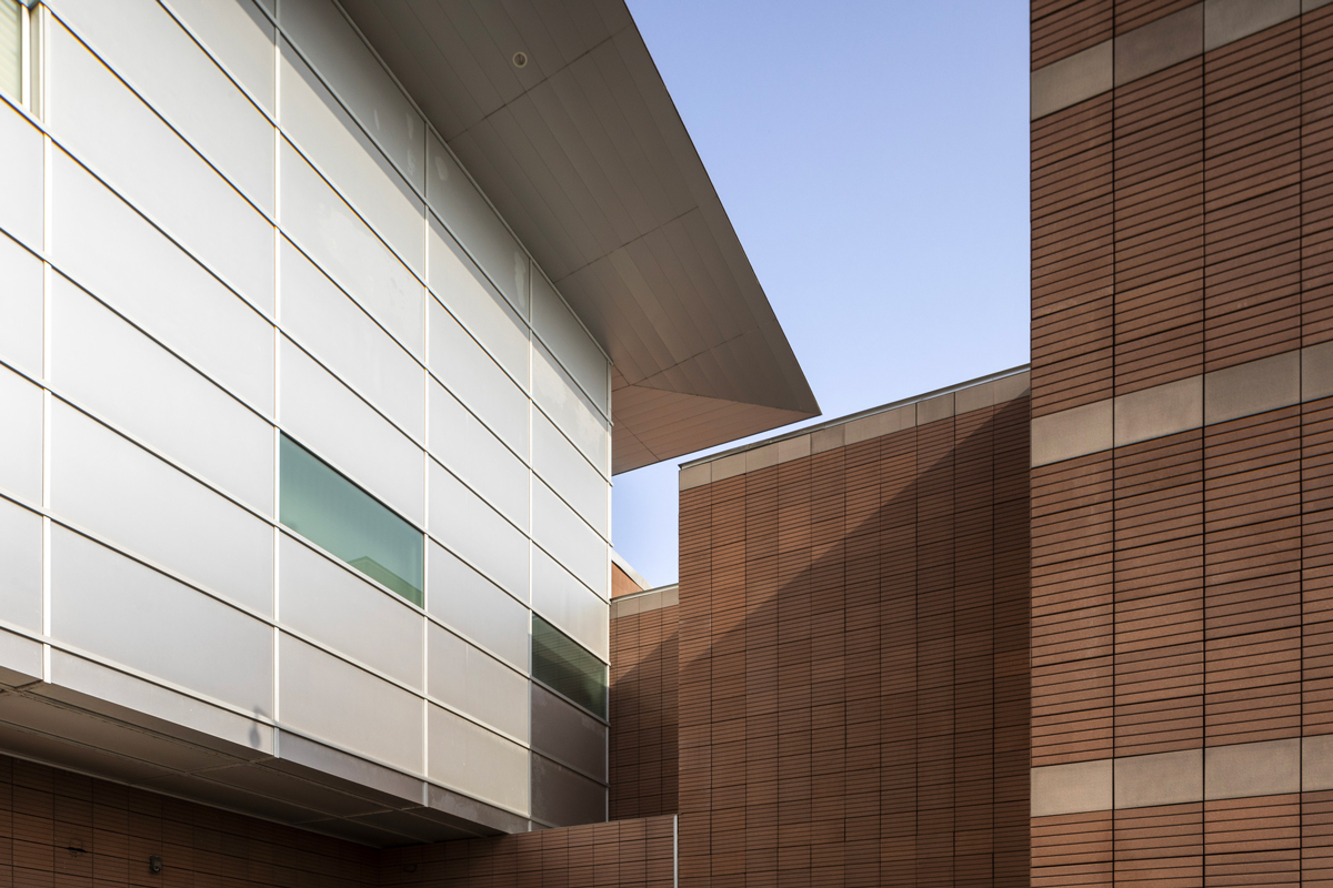 The new volumes are clad with sheet metal panels whose dimensions and colours dialogue with the existing façade. The new texture, while retaining the sense of horizontality of the existing one, through the use of panels with different coloured sheet metal creates a “pixel” effect that is gradually accentuated towards the north-west corner of the added body. All the architectural elements not only comply with the performance characteristics required by current regulations, but also guarantee higher performance as required by the breeam in use certification.