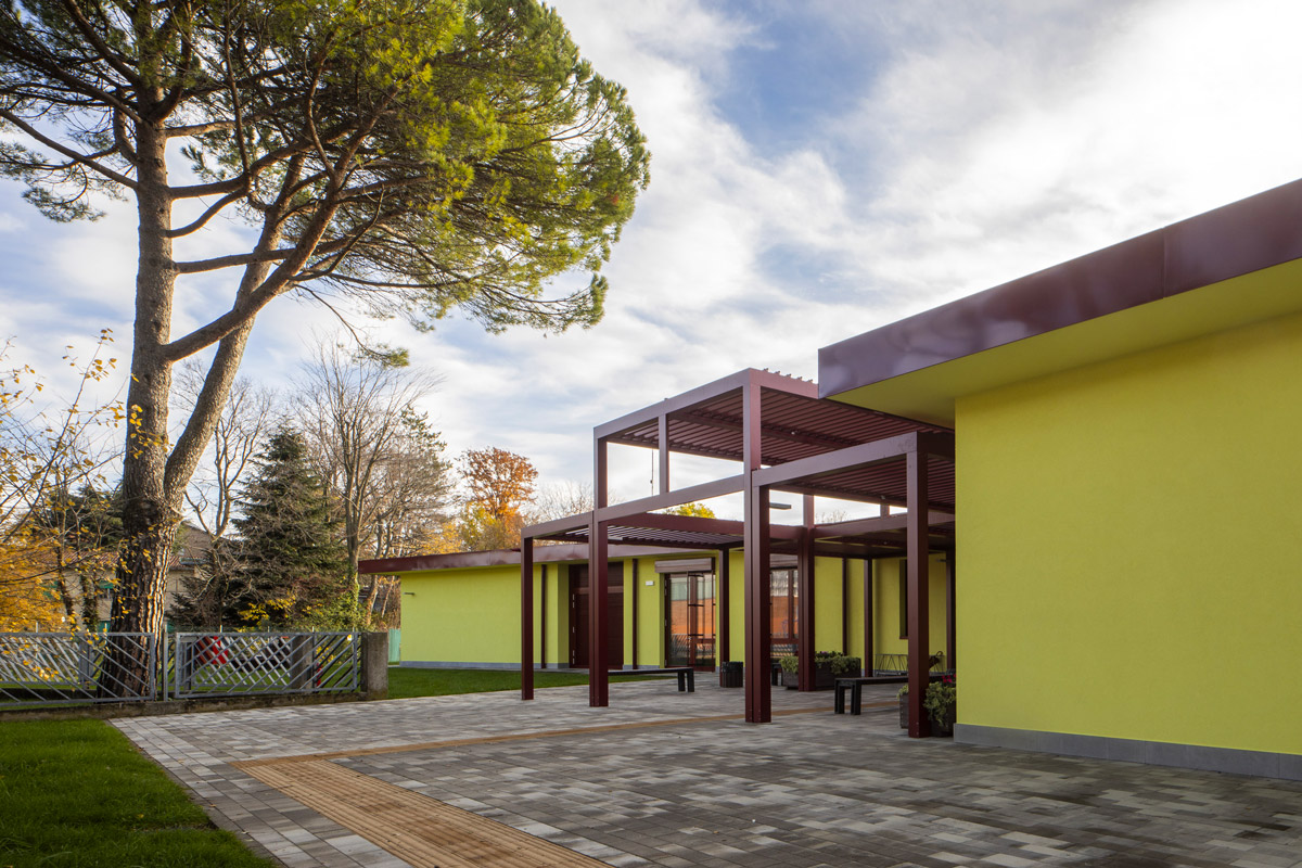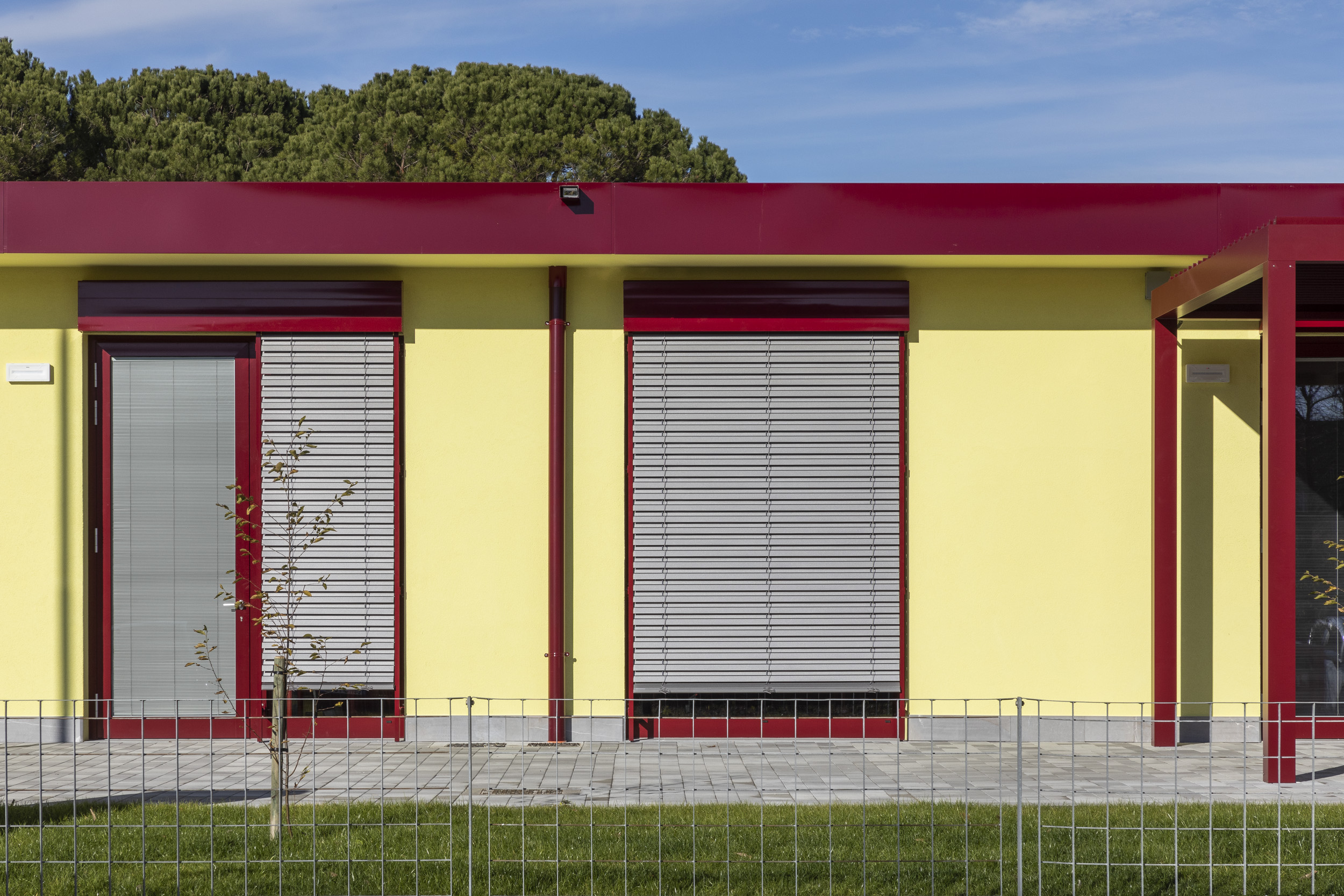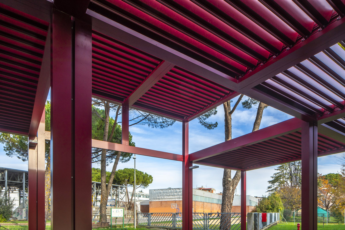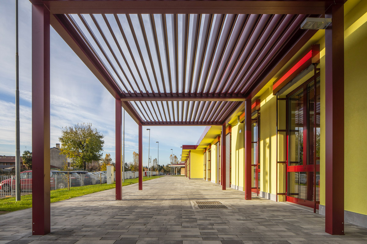 In terms of landscaping, the classrooms are surrounded by a green curtain formed by thirty new trees, integrating into an environmentally rich part of the city. Structurally independent metal sunshade canopies complete the outdoor spaces.
