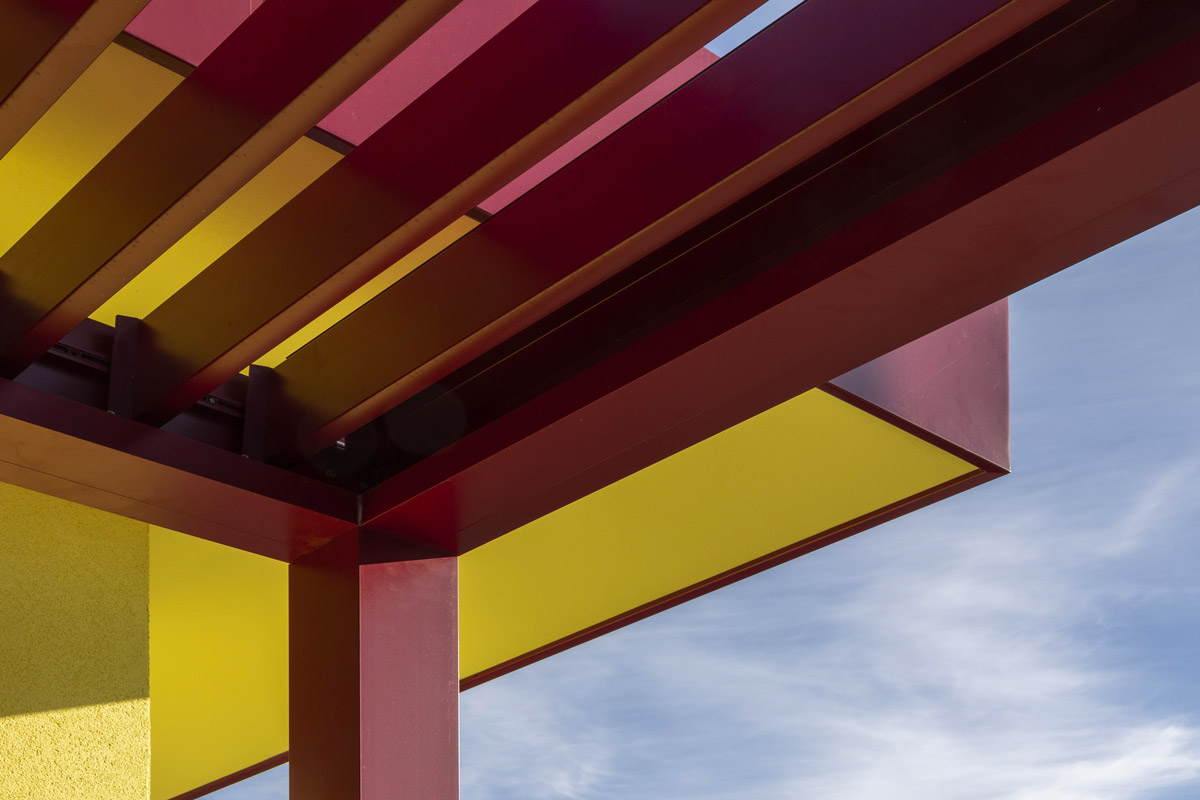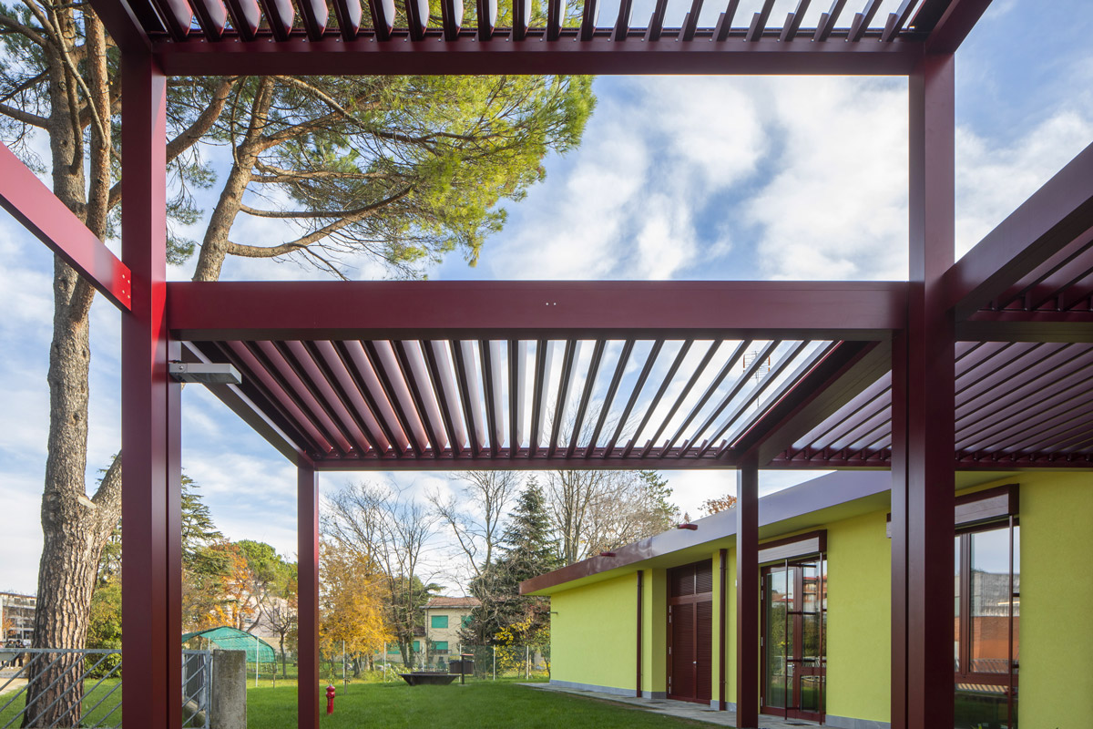The perimeter of the building features a pleasant system of climatic pergolas with adjustable slats that adds a strong element of character to the architecture. At the same time, this system ensures adequate filtering of the sun’s rays and protection of the masonry from weathering, resulting in improved living comfort and reduced maintenance costs over time.
