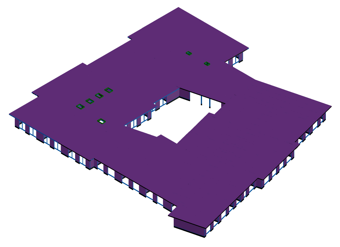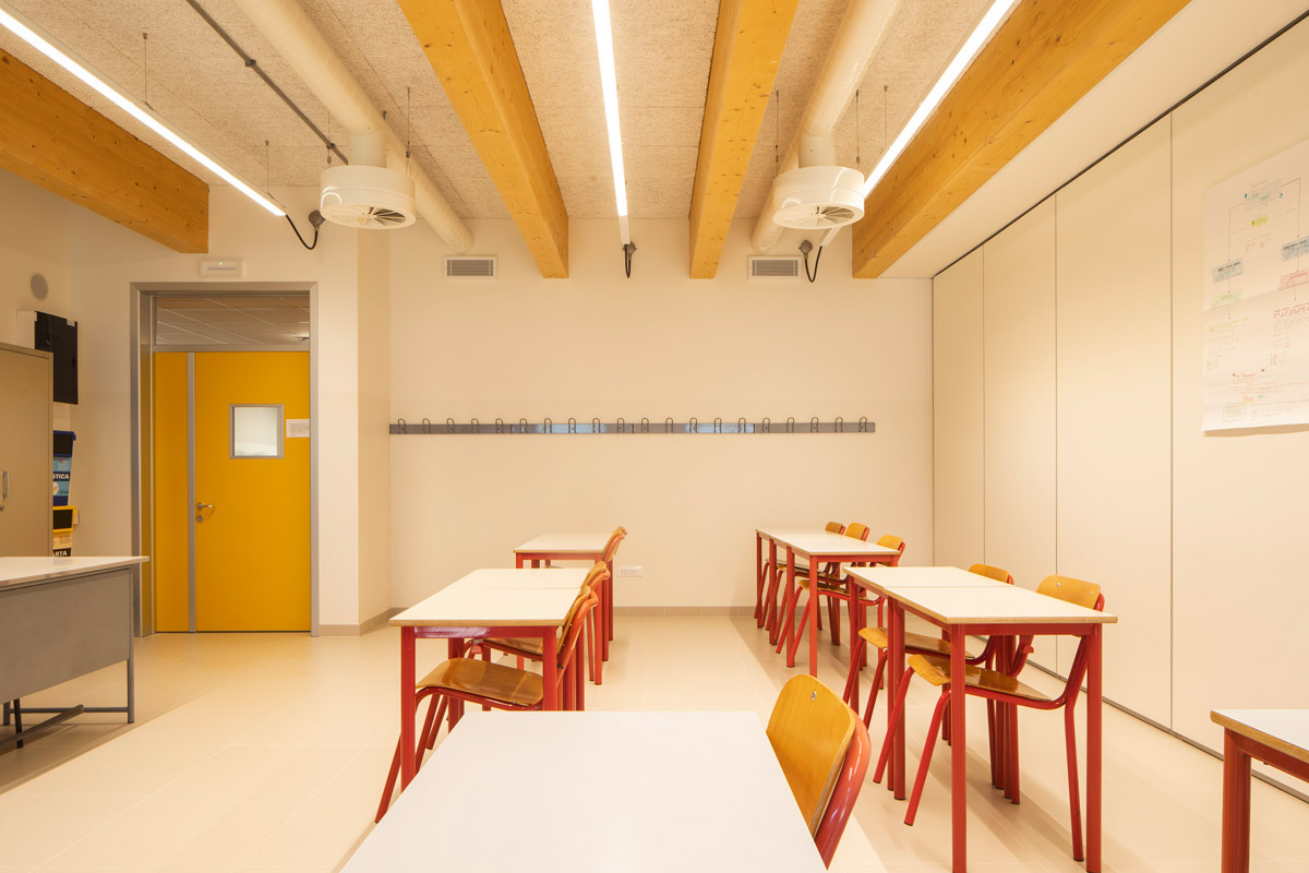 The upper exterior finish, a continuous TPO waterproofing membrane laid over high-density rock wool insulation, has a slope of 2 percent. The ceiling in classrooms is made of mineralized wood wool panels with good sound-absorbing capacity; in other spaces, the suspended ceiling contains the passage of equipment. Classrooms and atrium located to the south have the main exposed glulam beams of 20×52 cm cross-section with the function as a breaker for the roof panels.