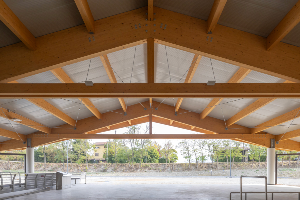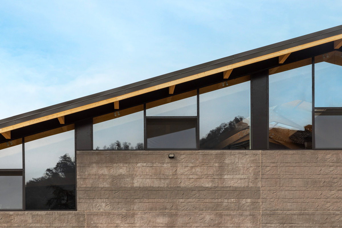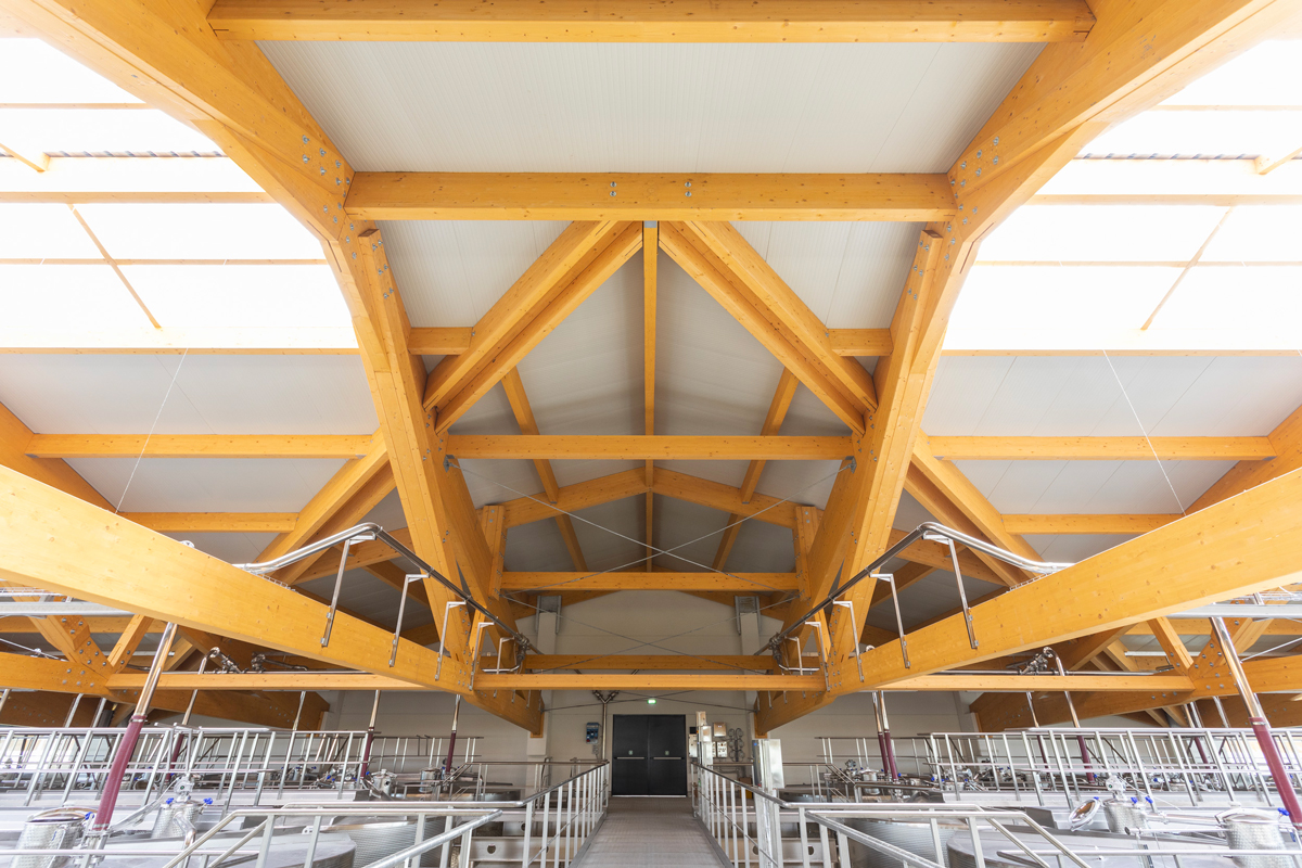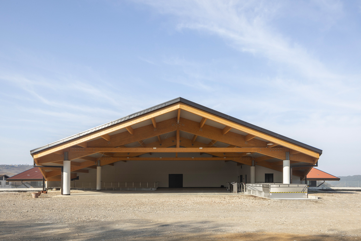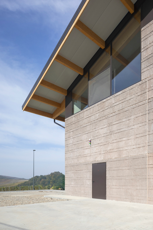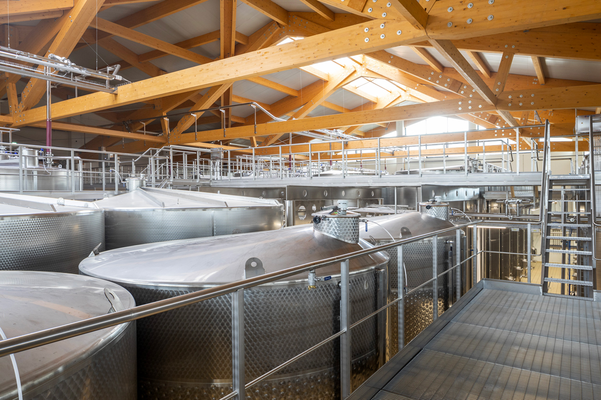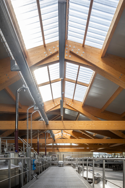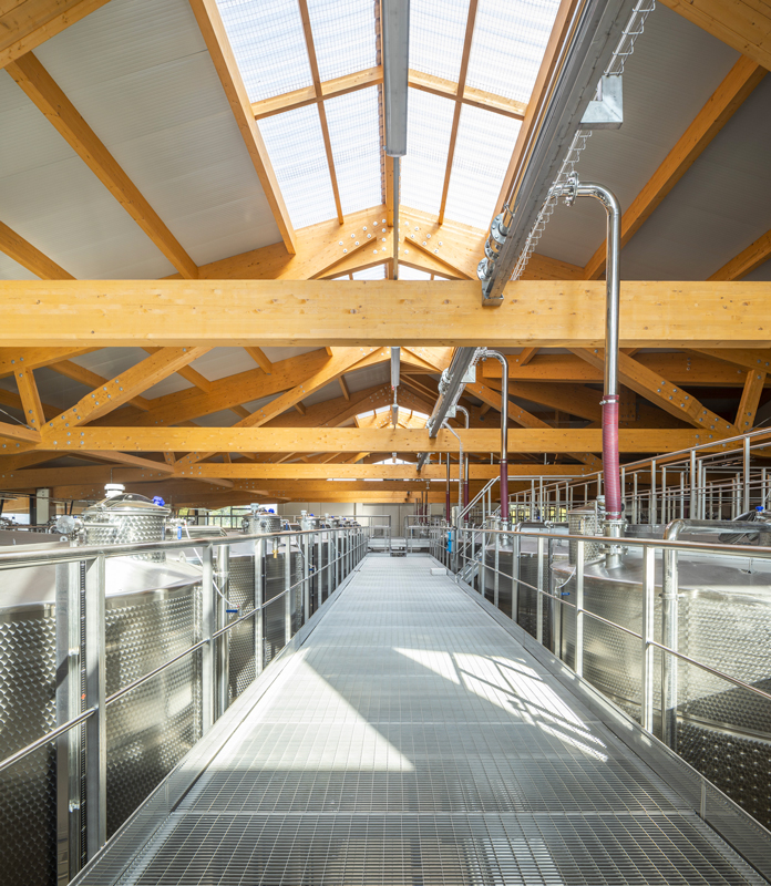 The design of the Tenuta di Caseo winery for Tommasi Family Estates incorporates the need for new space for processing grapes through a single span room with glulam beams having a span of 34 metres. The open-plan interior space allows the steel tanks to be positioned in a rational manner, facilitating access routes for grape intake, processing and fermentation control; a walkway, also in steel, allows access to the upper hatches. The volume responds to functional requirements with simplicity and rigour, on the one hand by means of a rectangular floor plan measuring 54×41 metres, and on the other thanks to the use of a few materials: wood for the beams, exposed concrete for the vertical structure, and glass and thermally broken cladding panels for the curtain walls. The outer skin is characterised by an earth-coloured iridescent surface simulating split stone.