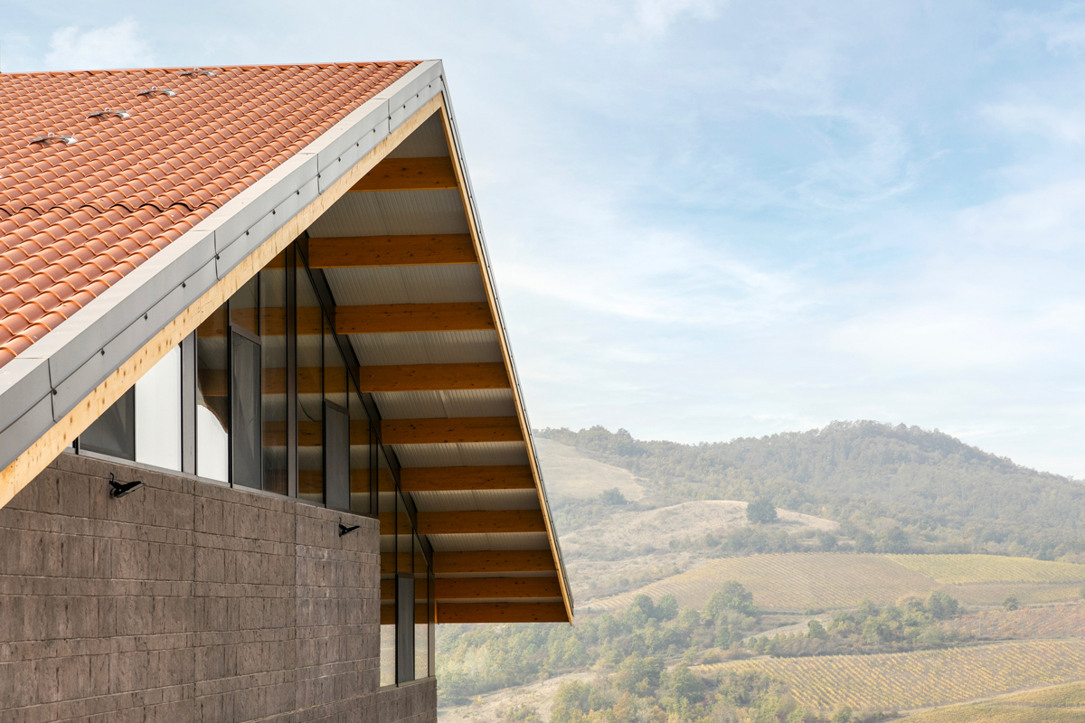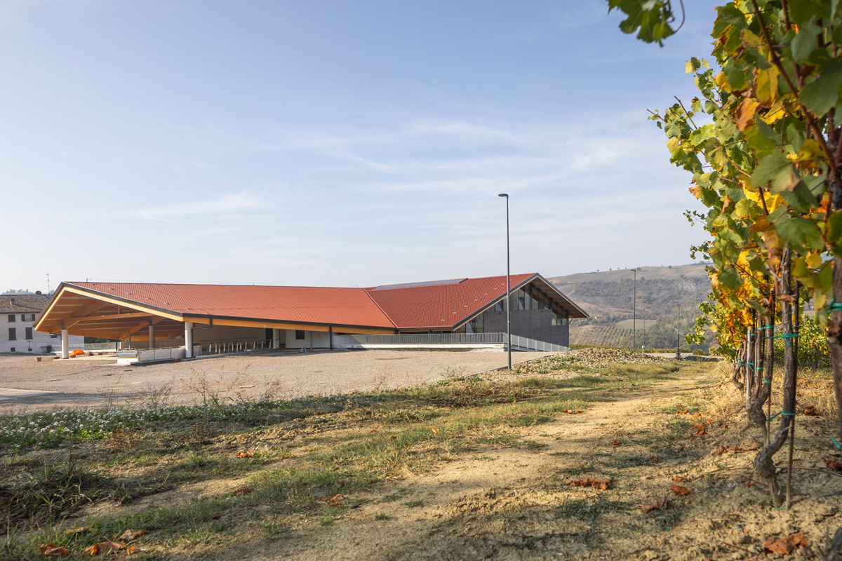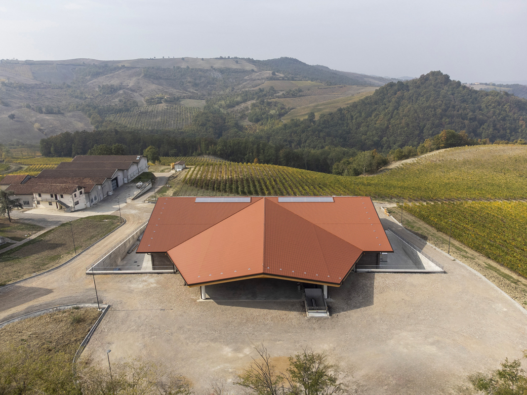 The result is a body of building that presents itself as a compact volume on which the multi-pitched roof rests lightly, almost as if to simulate the orographic trend of the gentle hills typical of this geographical area. The difference in elevation identifies the two levels that dialogue with the context: the urban landscape to the east, the vineyard slopes to the west, southwest and northwest. The new spaces, entirely designed by the Moretti Modular Contractor’s technical office, were the result of a comparison between urban planning constraints, the morphology of the terrain and the technical requirements linked to the Tommasi family’s oenological needs. The new plant is completed by the external arrangements adjacent to the building, which are also functional to the work carried out in the winery. Overall, the intervention is almost 3000 m2.