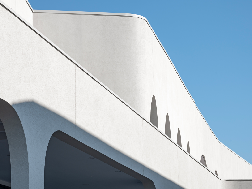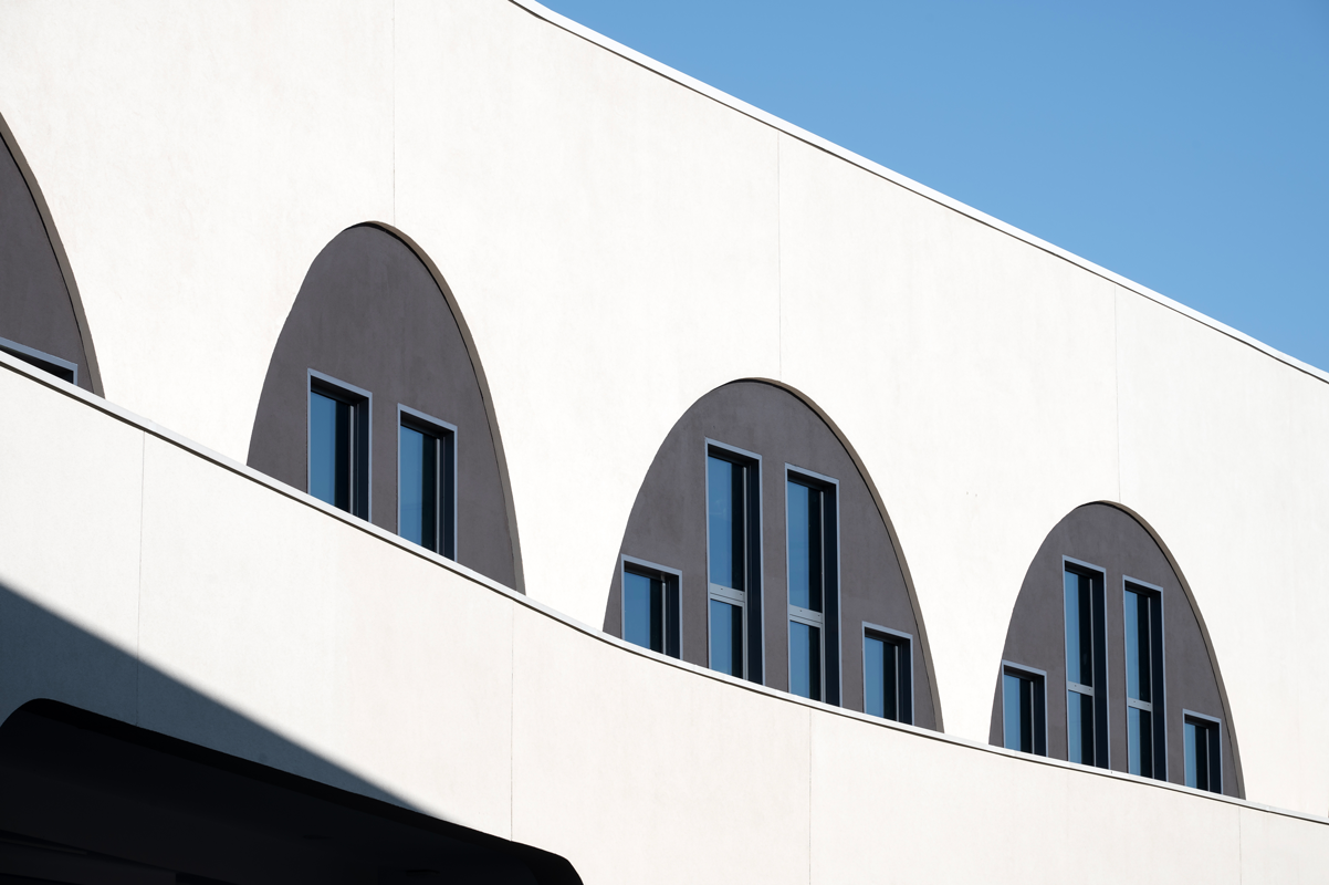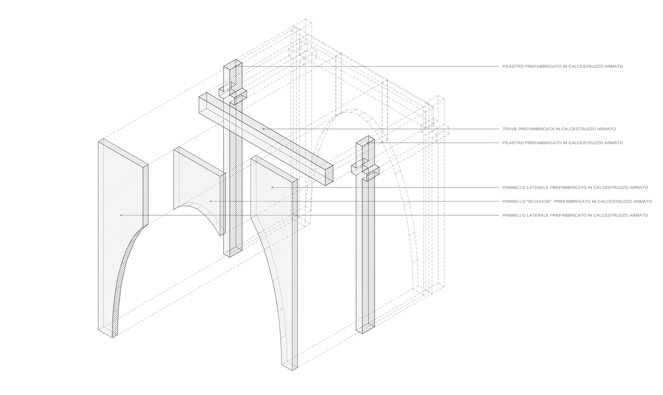 The decision to use off-site industrialised manufactured products, including pillars, beams, inverted omega tiles, and TT tiles, allowed Moretti to realise the architectural project with high speed and maximum quality control. In particular, the decision to reproduce the design of the arched façades, the stylistic hallmark of the project, by building them with a modular system of panels capable of guaranteeing a perfectly rhythmic scansion, in which disharmonies are not perceived and the cleanliness of the curvilinear sign is maximum.