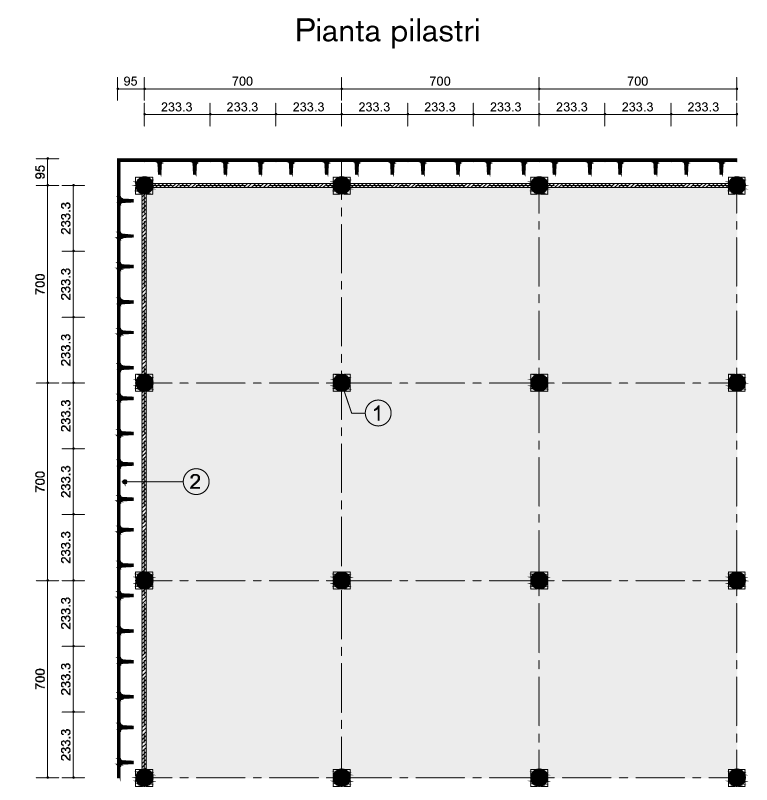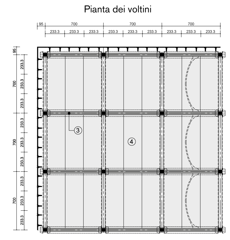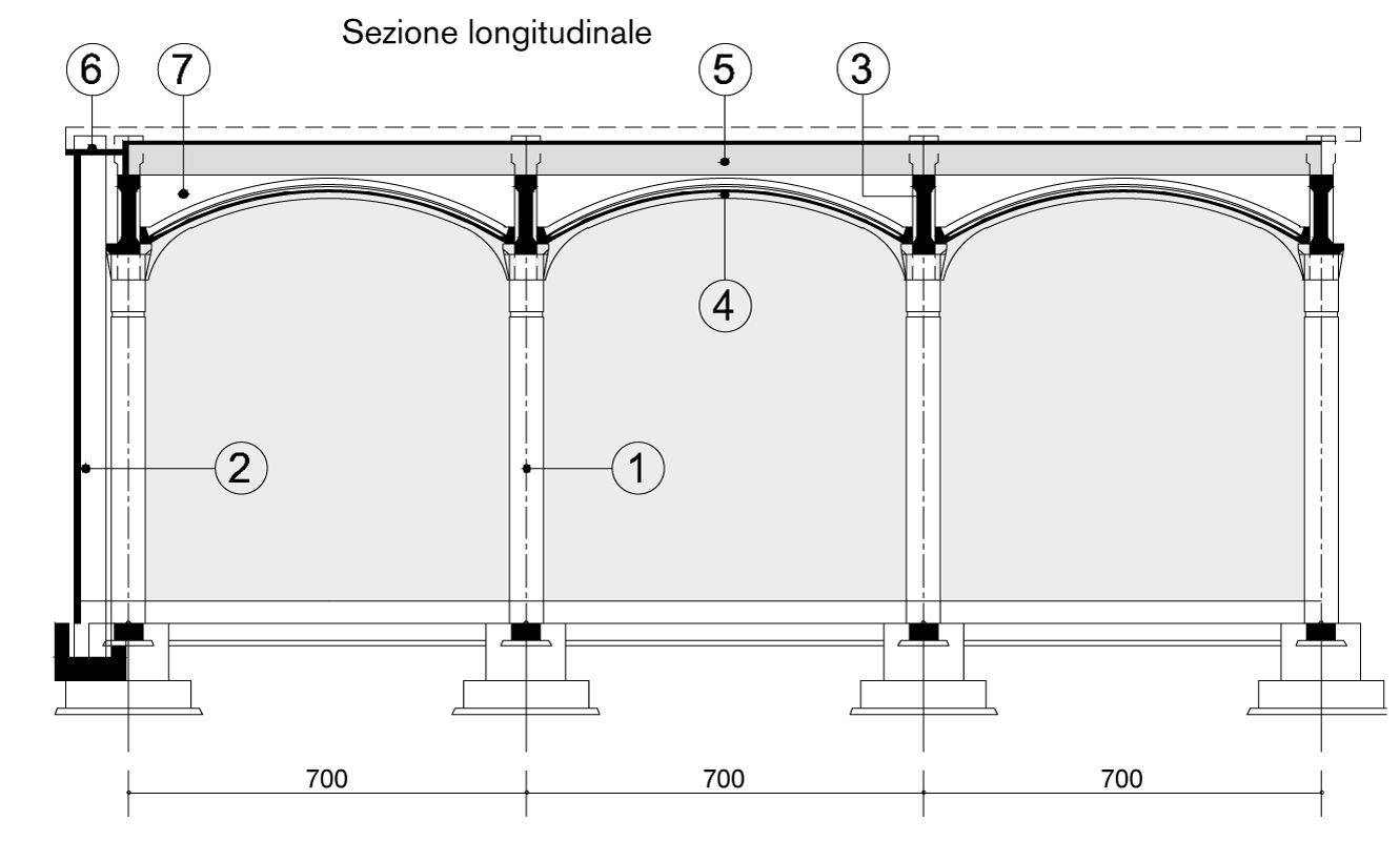 The main element of this system is a barrel vault. This type of roofing forms a square structural framework of 7×7 metres. The support structure is protected on round columns with a diameter of 60 centimetres, complete with capitals to support the beams with arched intrados and flat extrados that support the vault. An effective on-ground infill wall organically completes the system, which, at the customer’s discretion, can be supplemented with a slab floor and prefabricated reinforced concrete barrel racks.